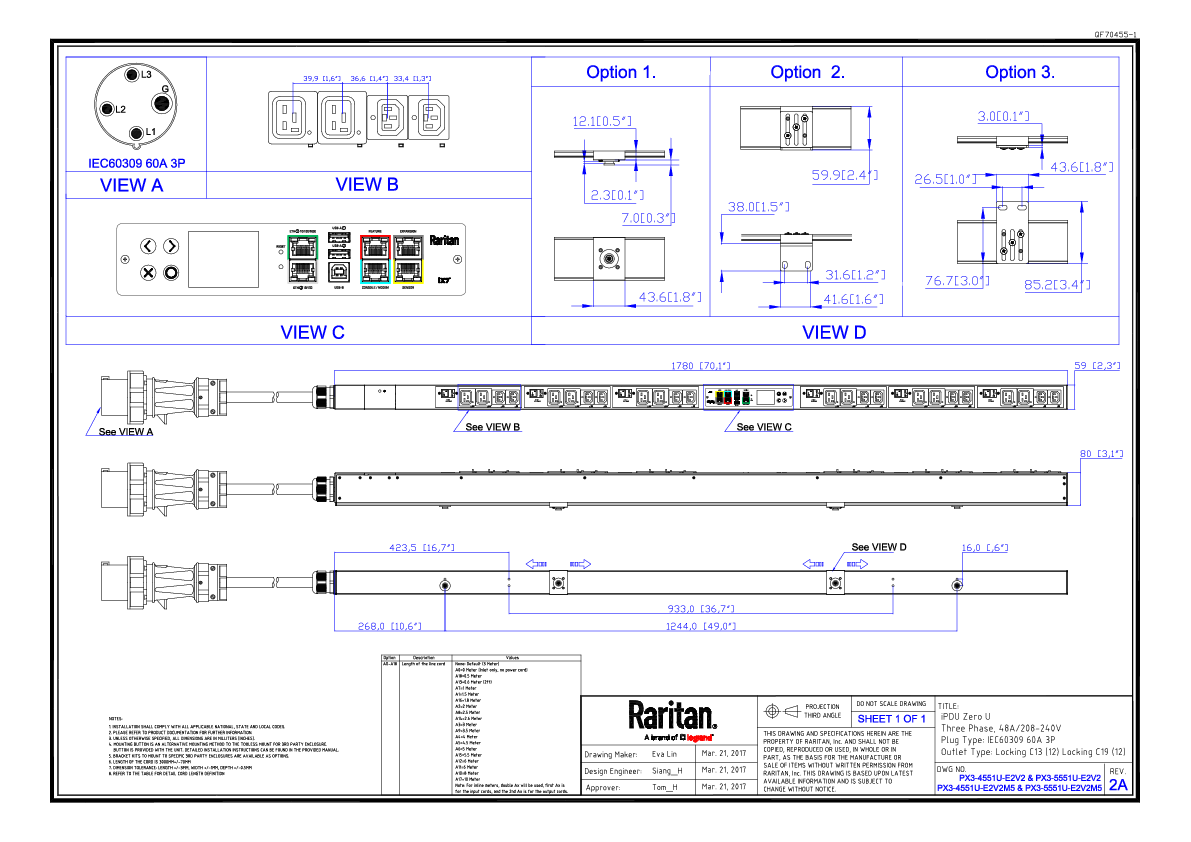 3PH, 208V AC, 60A (48A/PH rated); 24 outlets: 12x C13 Locking, 12x C19 Locking; plug: IEC 60309 3P+E 9h 60A (Delta Top-top feed), 17.3kVA; Outlet Metered, Zero U vertical PDU