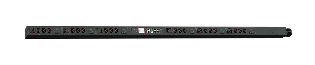 Monitored and switched rack power distribution unit (0U [vertical], 17.3kVA, 24 outlets). INPUT: 208v (3-phase DELTA), 48a - Hardwired [AC Terminal Block, No Cord]; OUTPUT: 18@ C13, 6@ C19 outlets; on 6@ 2-pole, 20a Overcurrent Protectors; FEATURES: Billing-Grade (+/- 1%) Energy Metering [kW, kVA, V, A, Power Factor] - per inlet, per breaker/fuse, per outlet; Remote network monitoring via HTML, JSON-RPC, SSH, Telnet, MODBUS/TCP, and SNMPv3. Onboard embedded processor with minimum 536MHz clock speed, 16MB SPI Flash, and 64MB DDR2 RAM. Cascading upto 16 PDU's using single Ethernet or USB connection. Environmental monitoring [temp/humidity] capable – up to 32 sensors. Individual outlet numbers labeled on chassis. Automated deployment via TFTP, DHCP, SSH(CLI), or USB Flash Drives. WiFi Capable. USB Webcam Capable. iPad/iPhone/Android App. Dual 10/100/1000 Ethernet port. Tri-color status LED per receptacle. Breaker metering and alarming (0V detection). Max Dimensions 59mm x 80mm x 1780mm (2.3in x 3.1in x 70.1in). Max Weight 7.5 kg. Maximum ambient temperature 60C at full load.