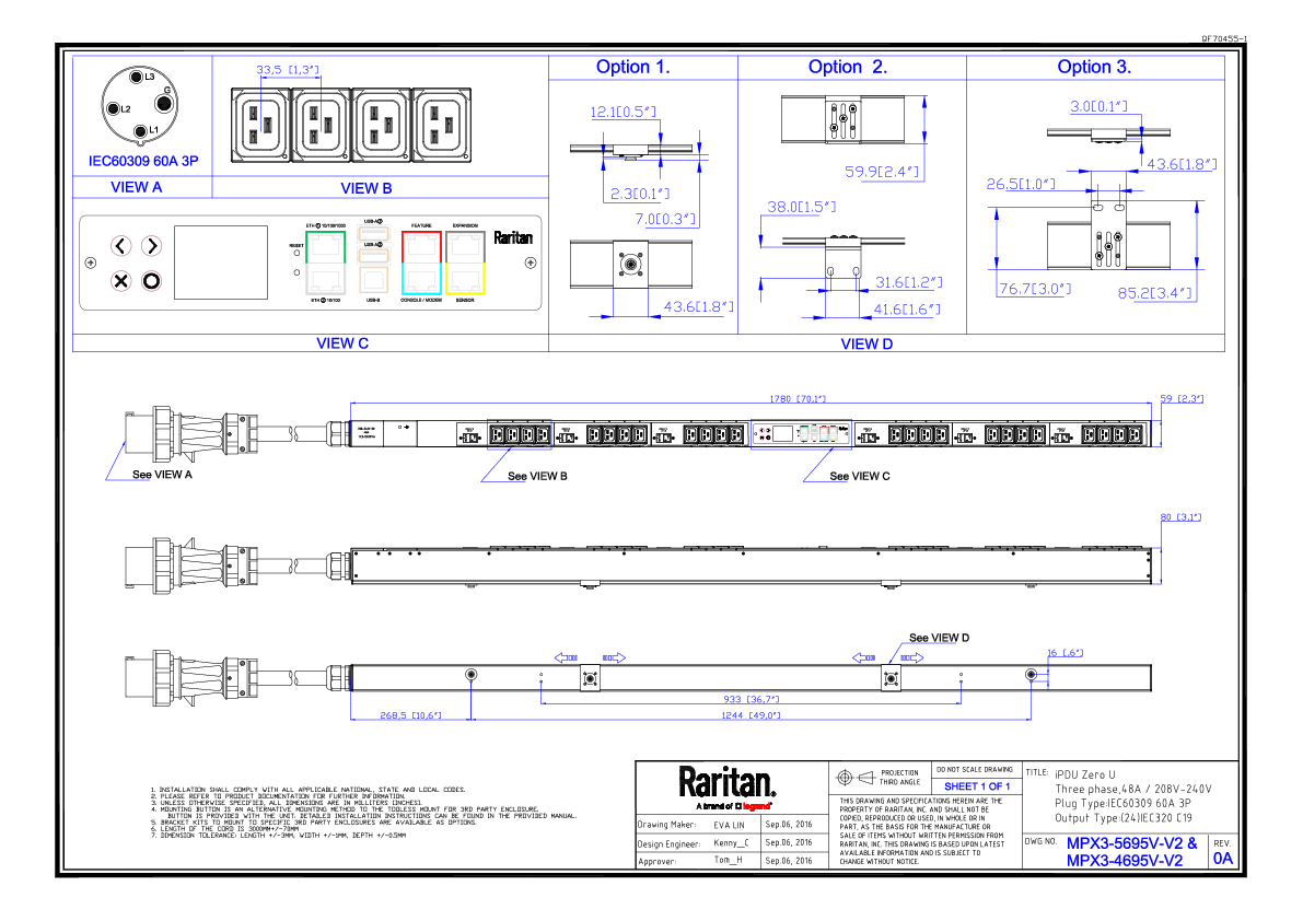 Monitored and switched rack power distribution unit (0U [vertical], 17.3kVA, 24 outlets). INPUT: 208v (3-phase DELTA), 60a - IEC 60309 3P+E 9h 60A plug (3P4W); OUTPUT: 24@ C19 outlets; on 6@ 2-pole, 20a Overcurrent Protectors; FEATURES: Billing-Grade (+/- 1%) Energy Metering [kW, kVA, V, A, Power Factor] - per inlet, per breaker/fuse, per outlet; Remote network monitoring via HTML, JSON-RPC, SSH, Telnet, MODBUS/TCP, and SNMPv3. Onboard embedded processor with minimum 536MHz clock speed, 16MB SPI Flash, and 64MB DDR2 RAM. Cascading upto 16 PDU's using single Ethernet or USB connection. Environmental monitoring [temp/humidity] capable – up to 32 sensors. Individual outlet numbers labeled on chassis. Automated deployment via TFTP, DHCP, SSH(CLI), or USB Flash Drives. WiFi Capable. USB Webcam Capable. iPad/iPhone/Android App. Dual 10/100/1000 Ethernet port. Tri-color status LED per receptacle. Breaker metering and alarming (0V detection). Max Dimensions 59mm x 80mm x 1780mm (2.3in x 3.2in x 70.1in). Max Weight TBD. Maximum ambient temperature 60C at full load.
