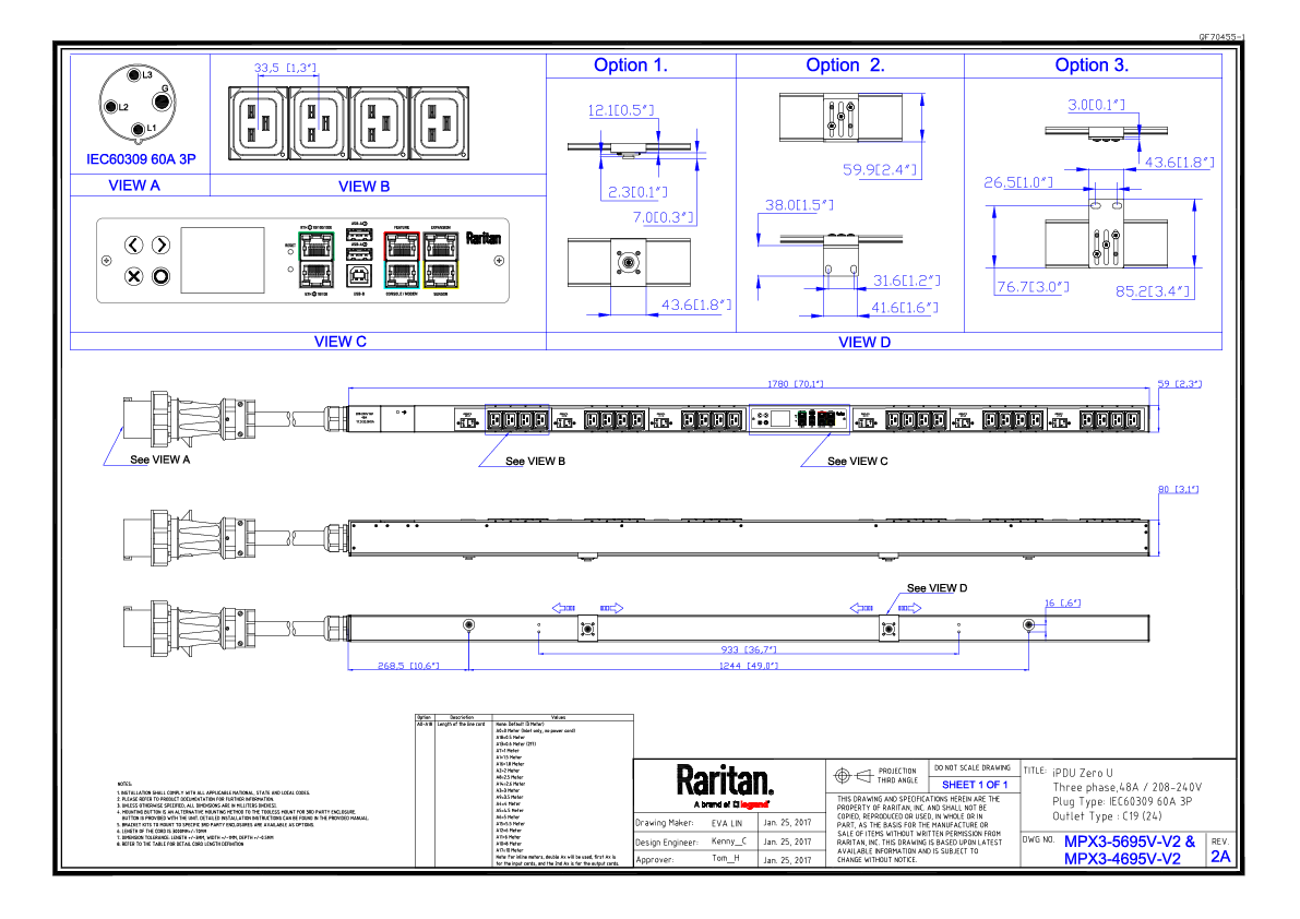 3PH, 208V AC, 60A (48A/PH rated); 24 outlets: 24x C19; plug: IEC 60309 3P+E 9h 60A (Delta Bottom-bottom feed), 17.3kVA; Outlet Metered, Zero U vertical PDU,