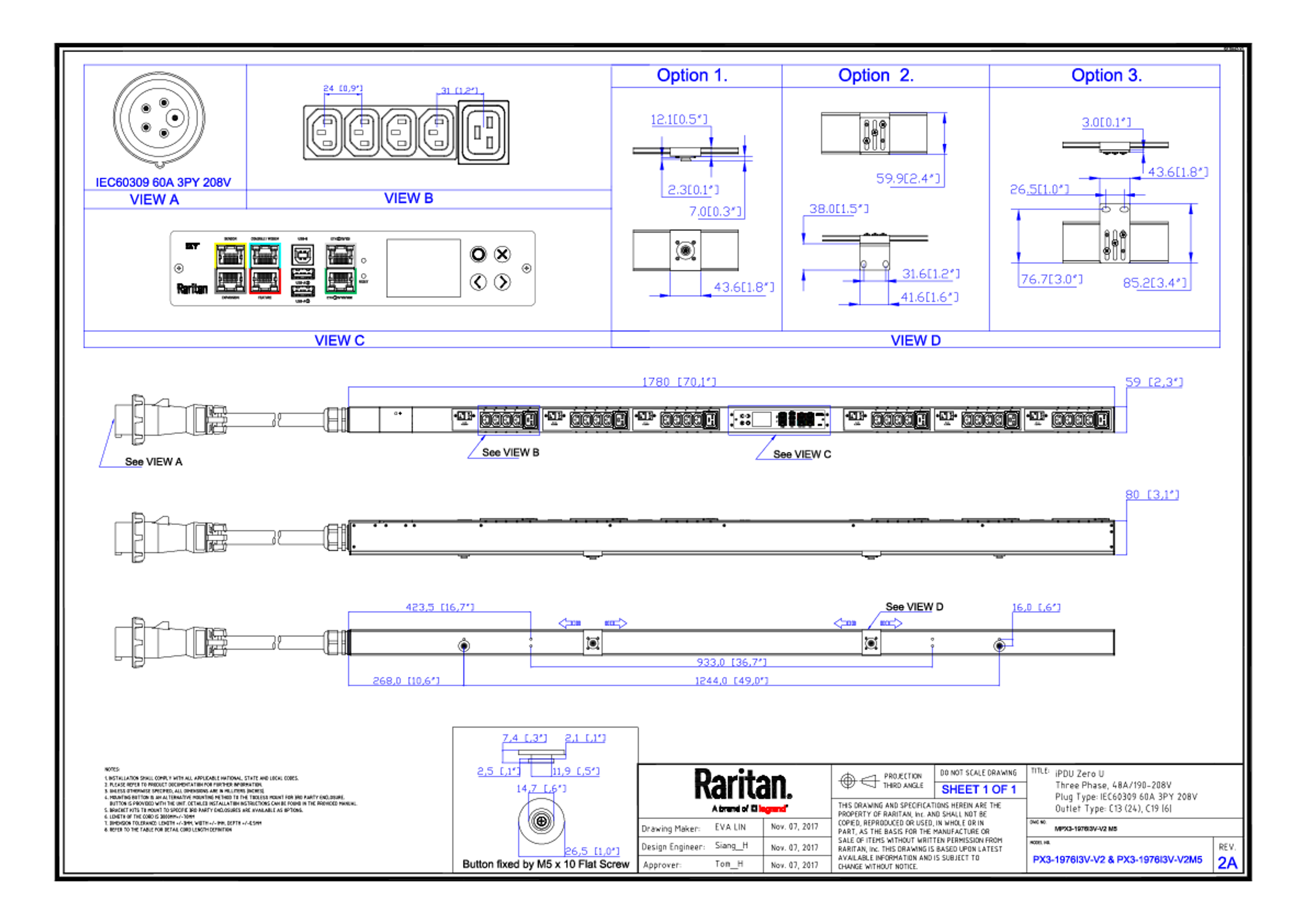 3PH, 208V AC, 60A (48A/PH rated); 30 outlets: 24x C13, 6x C19; plug: IEC 60309 3P+N+E 9h 60A (Delta Bottom-bottom feed), 17.3kVA; Unit Metered, Zero U vertical PDU