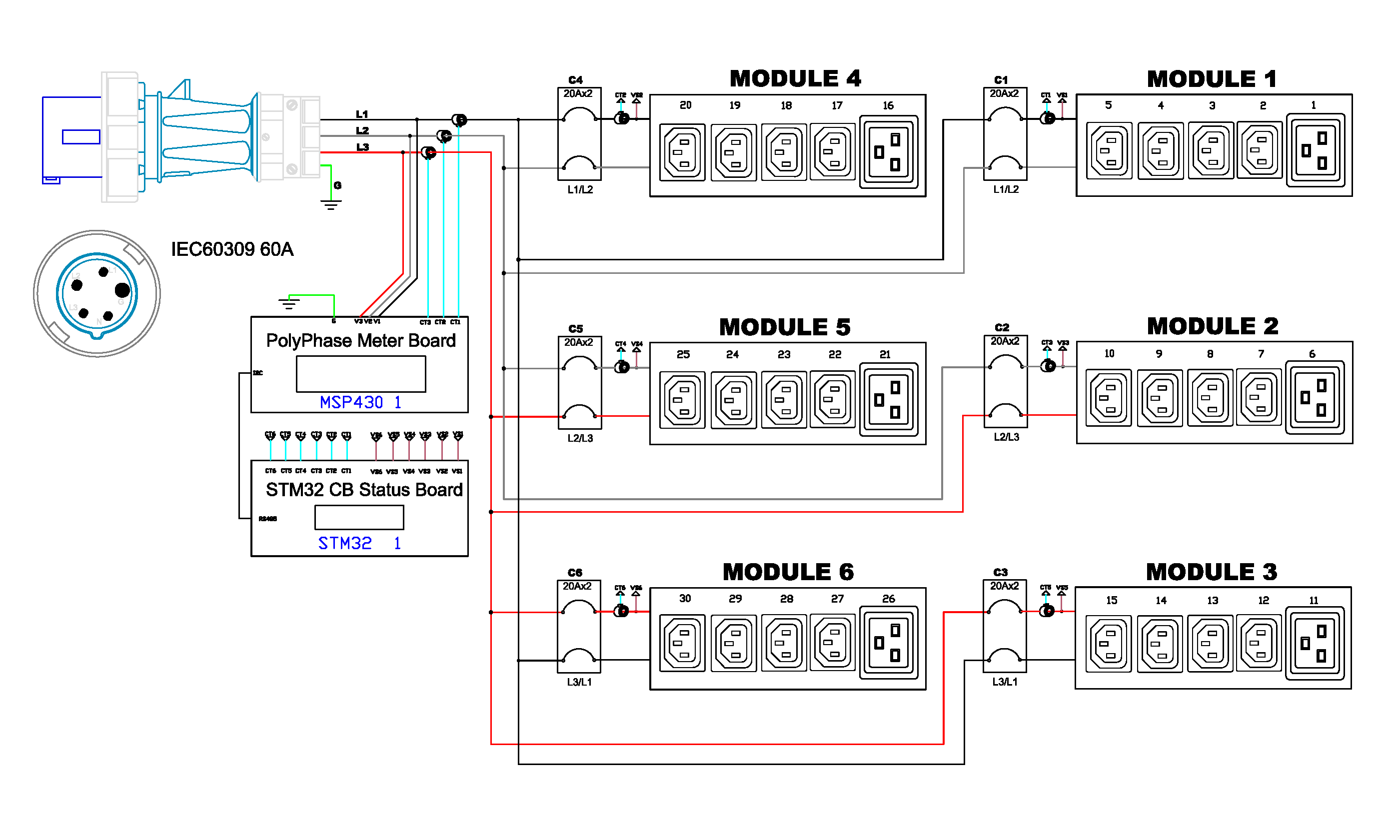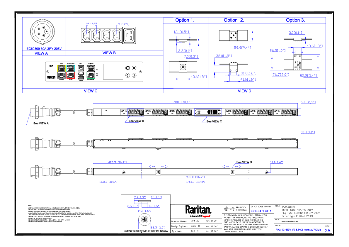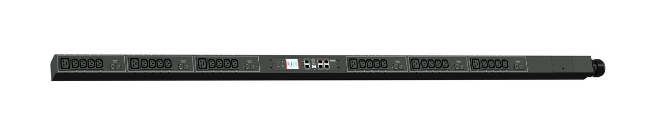 3PH, 208V AC, 60A (48A/PH rated); 30 outlets: 24x C13, 6x C19; plug: IEC 60309 3P+N+E 9h 60A (Delta Bottom-bottom feed), 17.3kVA; Unit Metered, Zero U vertical PDU