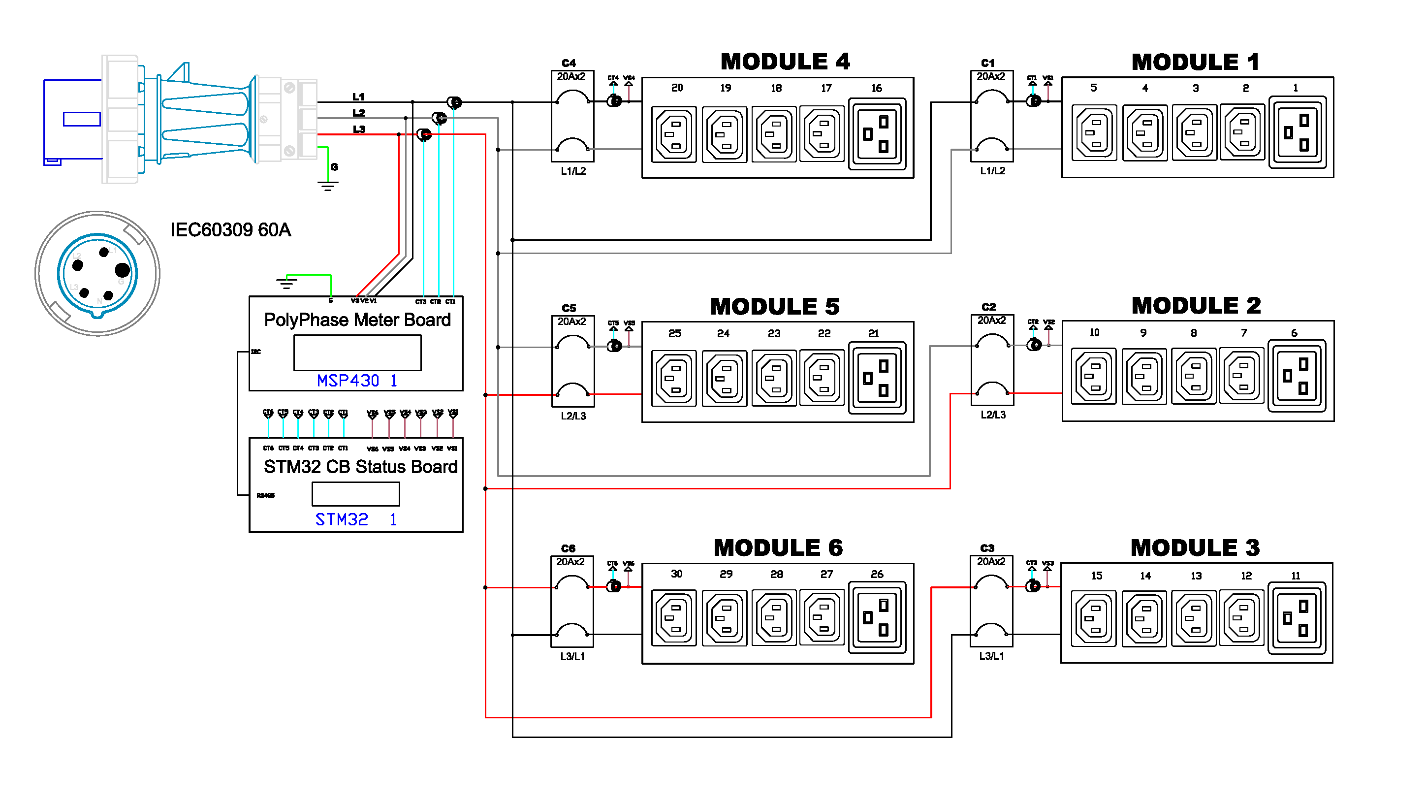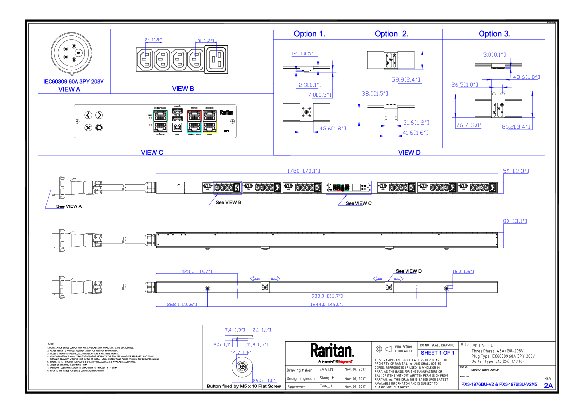 3PH, 208V AC, 60A (48A/PH rated); 30 outlets: 24x C13, 6x C19; plug: IEC 60309 3P+N+E 9h 60A (Delta Top-top feed), 17.3kVA; Unit Metered, Zero U vertical PDU