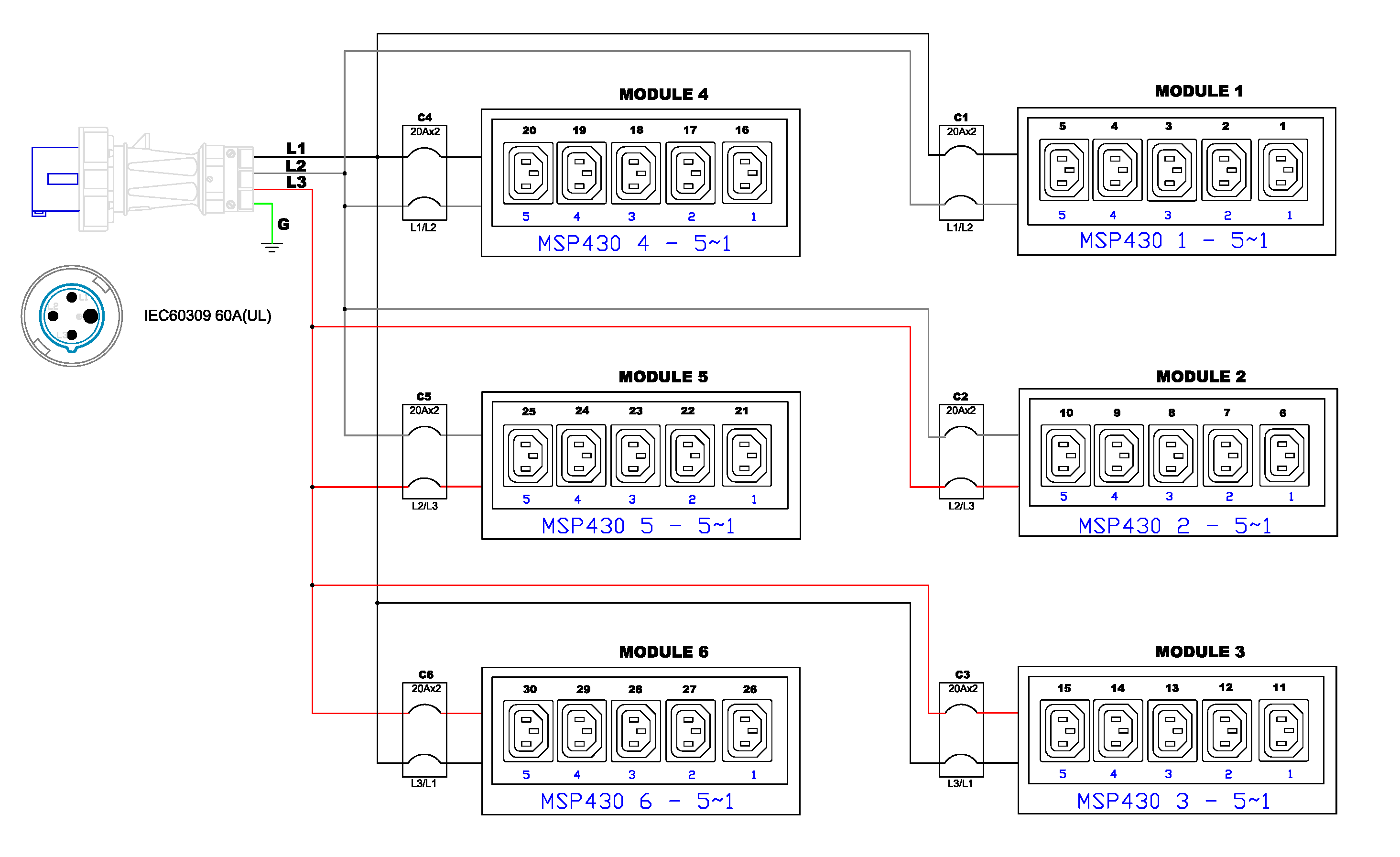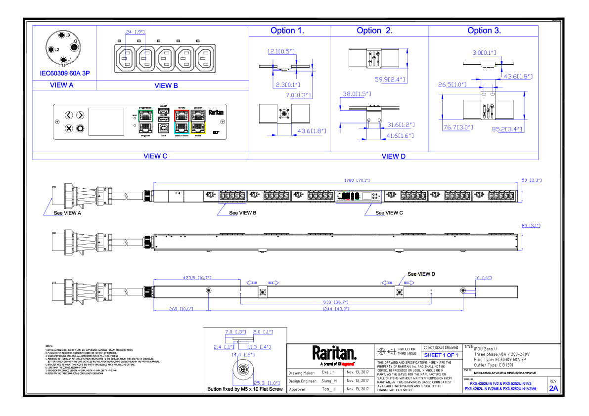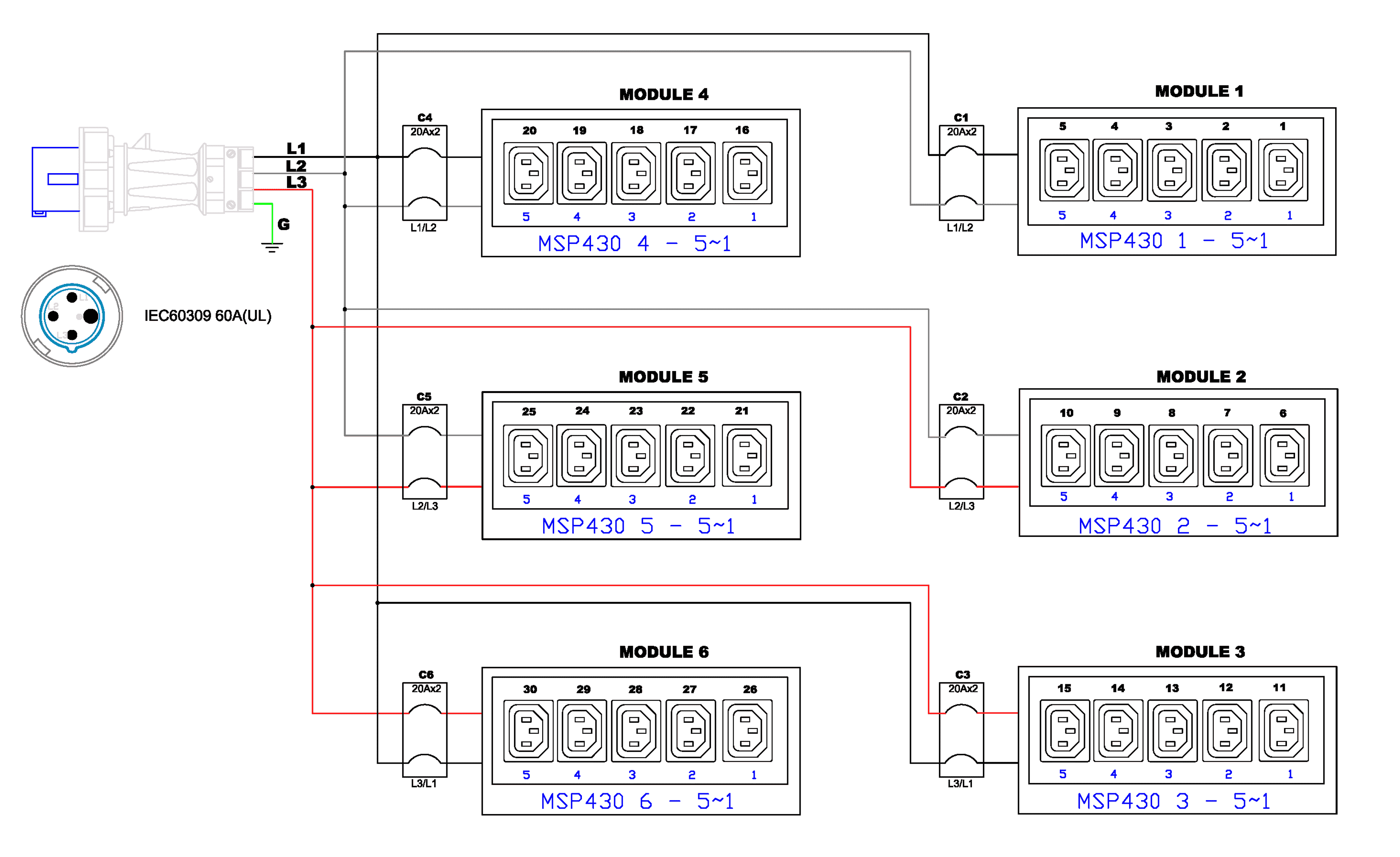 3PH, 208V AC, 60A (48A/PH rated); 30 outlets: 30x C13; plug: IEC 60309 3P+E 9h 60A (Delta Top-top feed), 17.3kVA; Outlet Metered, Zero U vertical PDU