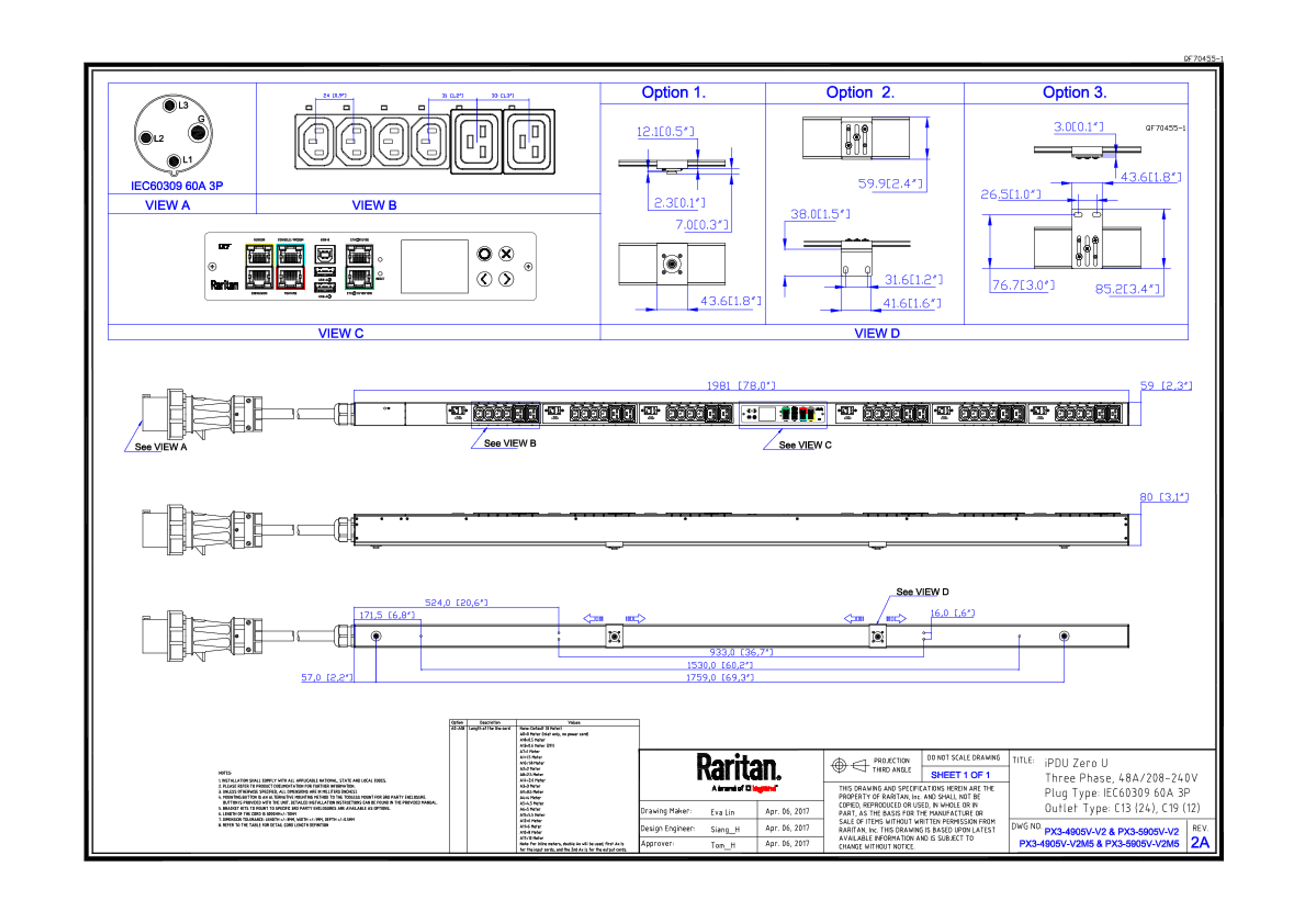 3PH, 208V AC, 60A (48A/PH rated); 36 outlets: 24x C13, 12x C19; plug: IEC 60309 3P+E 9h 60A (Delta Bottom-bottom feed), 17.3kVA; Outlet Metered/Switched, Zero U vertical PDU