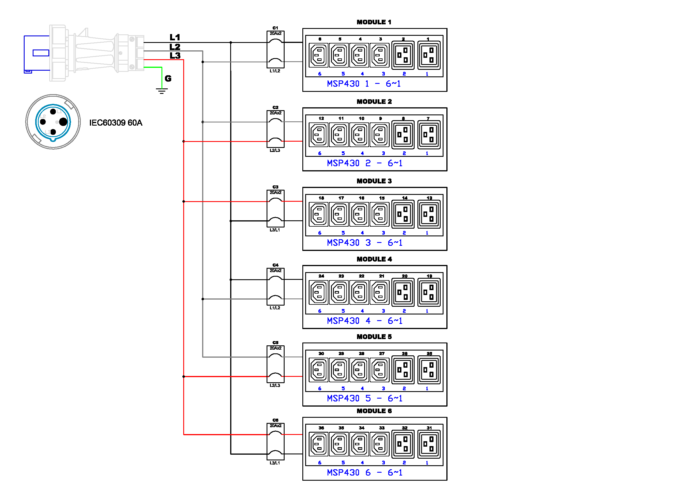 3PH, 208V AC, 60A (48A/PH rated); 36 outlets: 24x C13, 12x C19; plug: IEC 60309 3P+E 9h 60A (Delta Bottom-bottom feed), 17.3kVA; Outlet Metered/Switched, Zero U vertical PDU