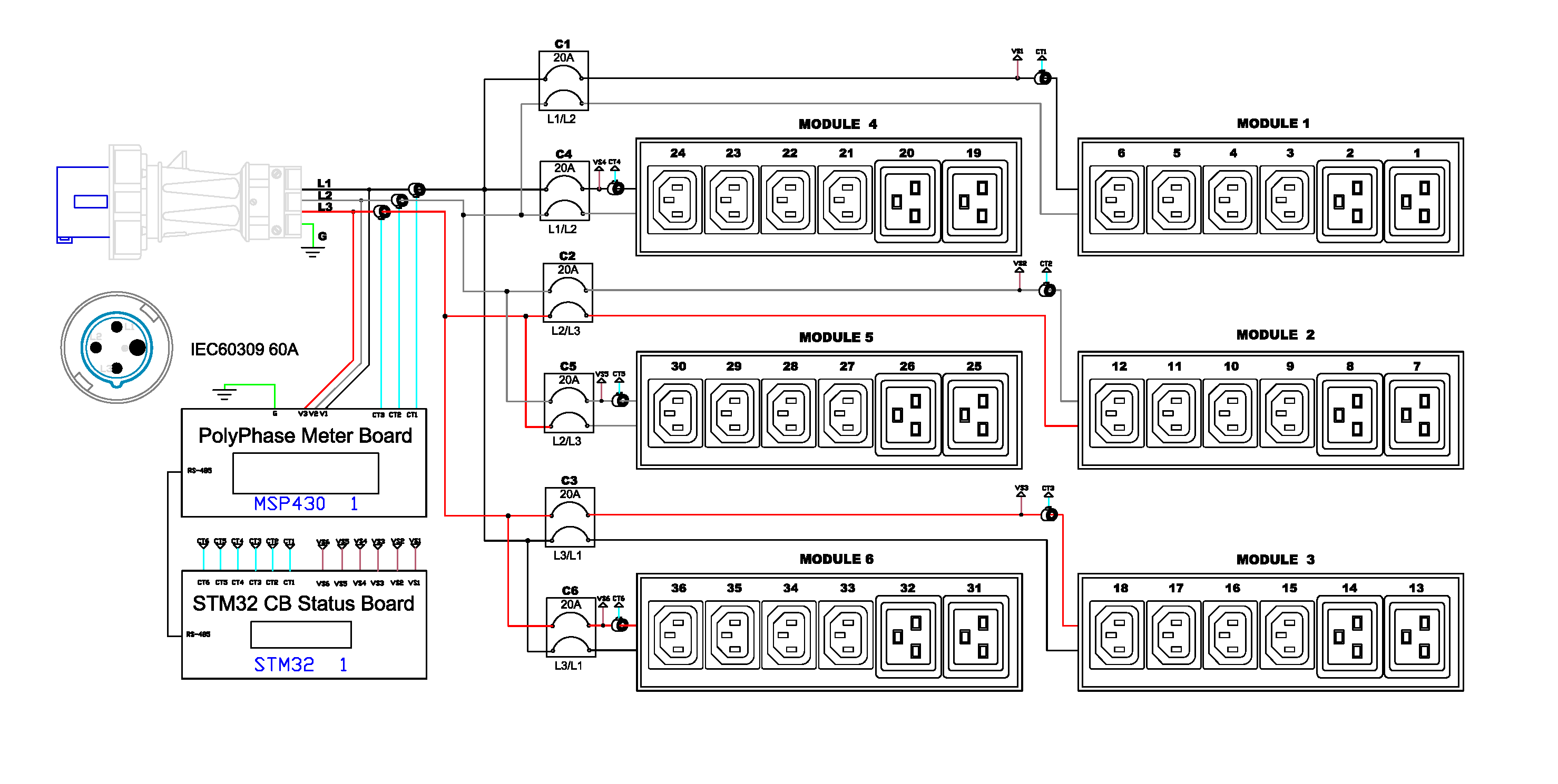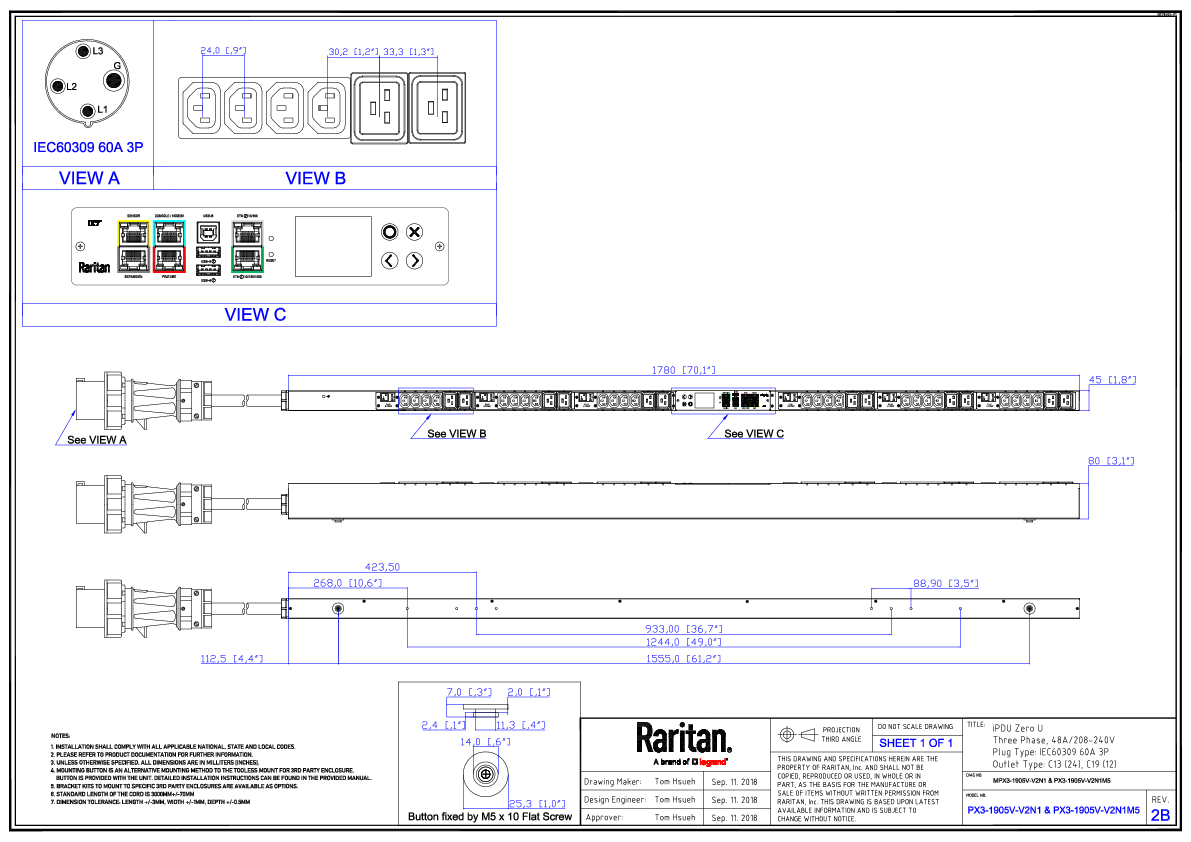 3PH, 208V AC, 60A (48A/PH rated); 36 outlets: 24x C13, 12x C19; plug: IEC 60309 3P+E 9h 60A (Delta Bottom-bottom feed), 17.3kVA; Unit Metered, Zero U vertical PDU