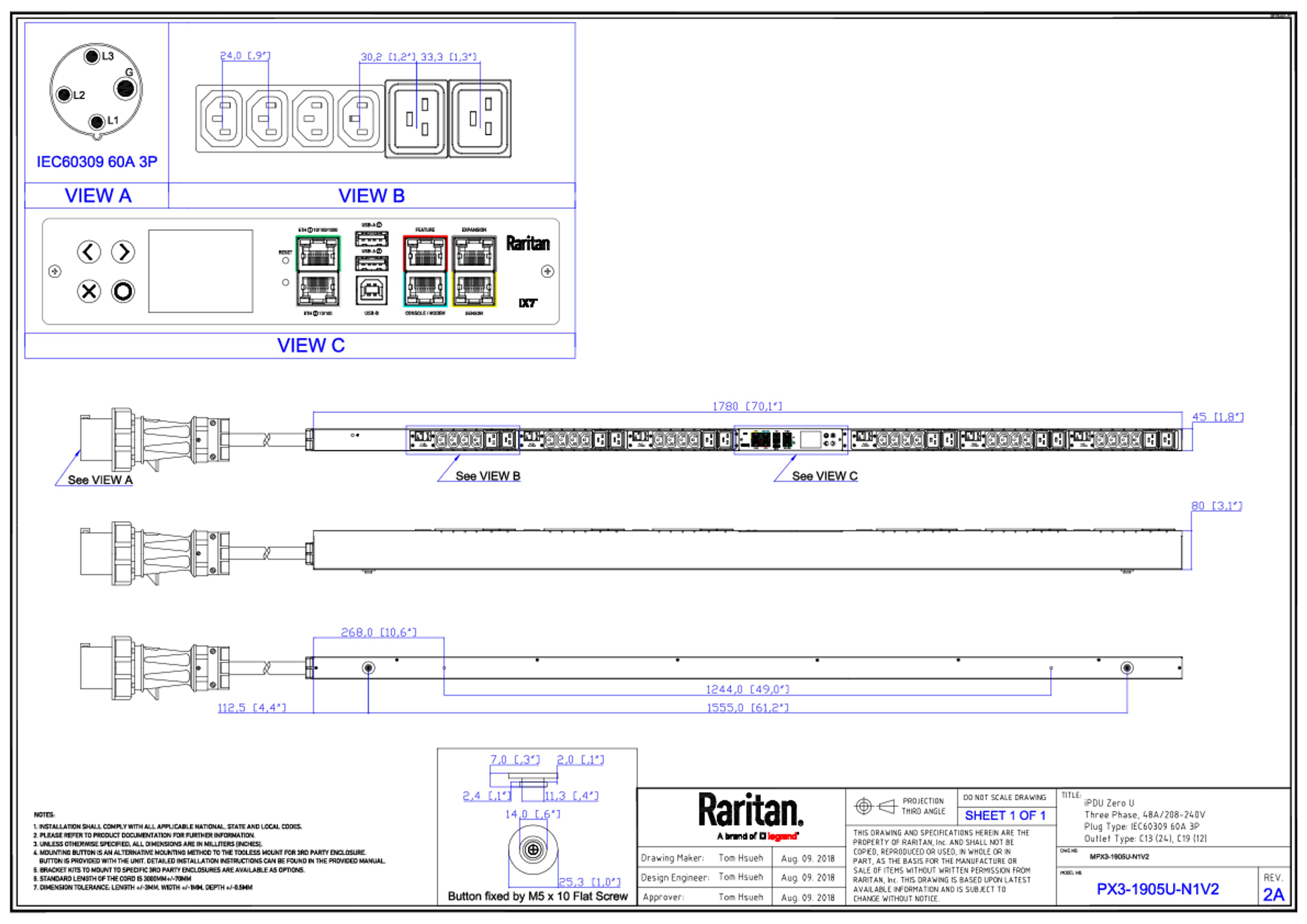 3PH, 208V AC, 60A (48A/PH rated); 36 outlets: 24x C13, 12x C19; plug: IEC 60309 3P+E 9h 60A (Delta Top-top feed), 17.3kVA; Unit Metered, Zero U vertical PDU, SecureLock ready