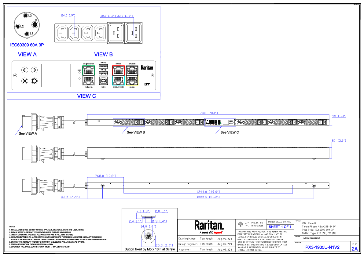 3PH, 208V AC, 60A (48A/PH rated); 36 outlets: 24x C13, 12x C19; plug: IEC 60309 3P+E 9h 60A (Delta Top-top feed), 17.3kVA; Unit Metered, Zero U vertical PDU, SecureLock ready