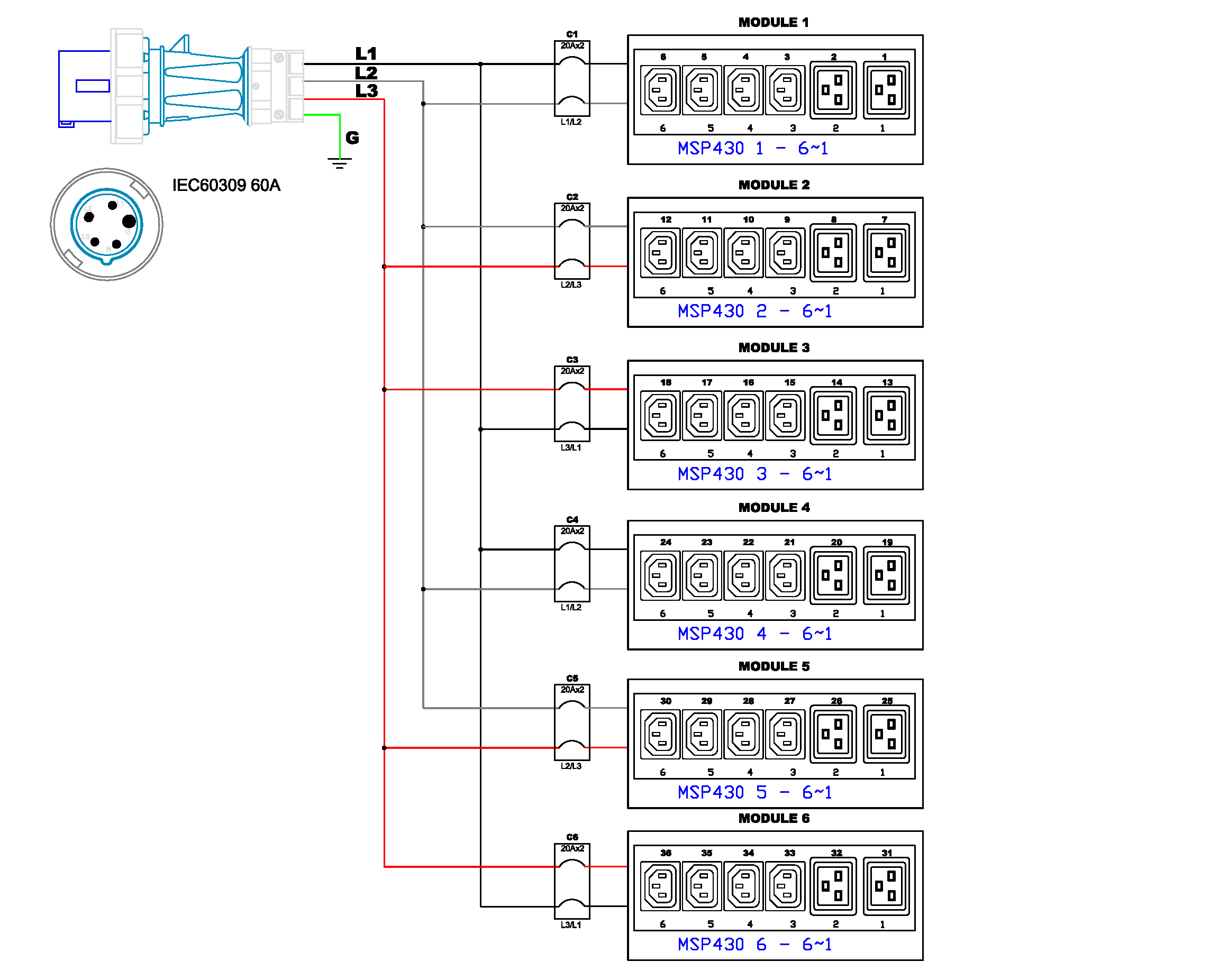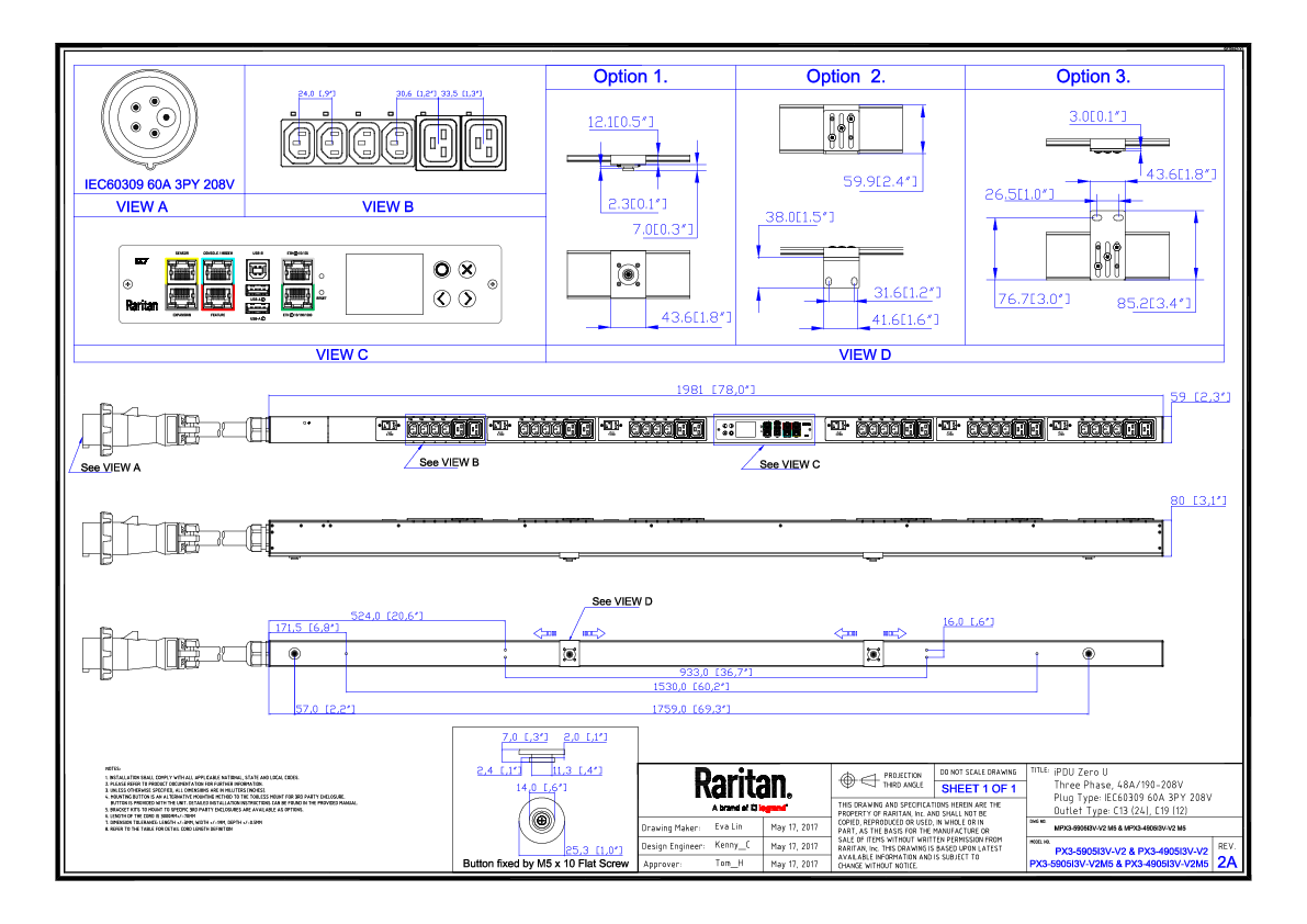 3PH, 208V AC, 60A (48A/PH rated); 36 outlets: 24x C13, 12x C19; plug: IEC 60309 3P+N+E 9h 60A (Delta Bottom-bottom feed), 17.3kVA; Outlet Metered/Switched, Zero U vertical PDU