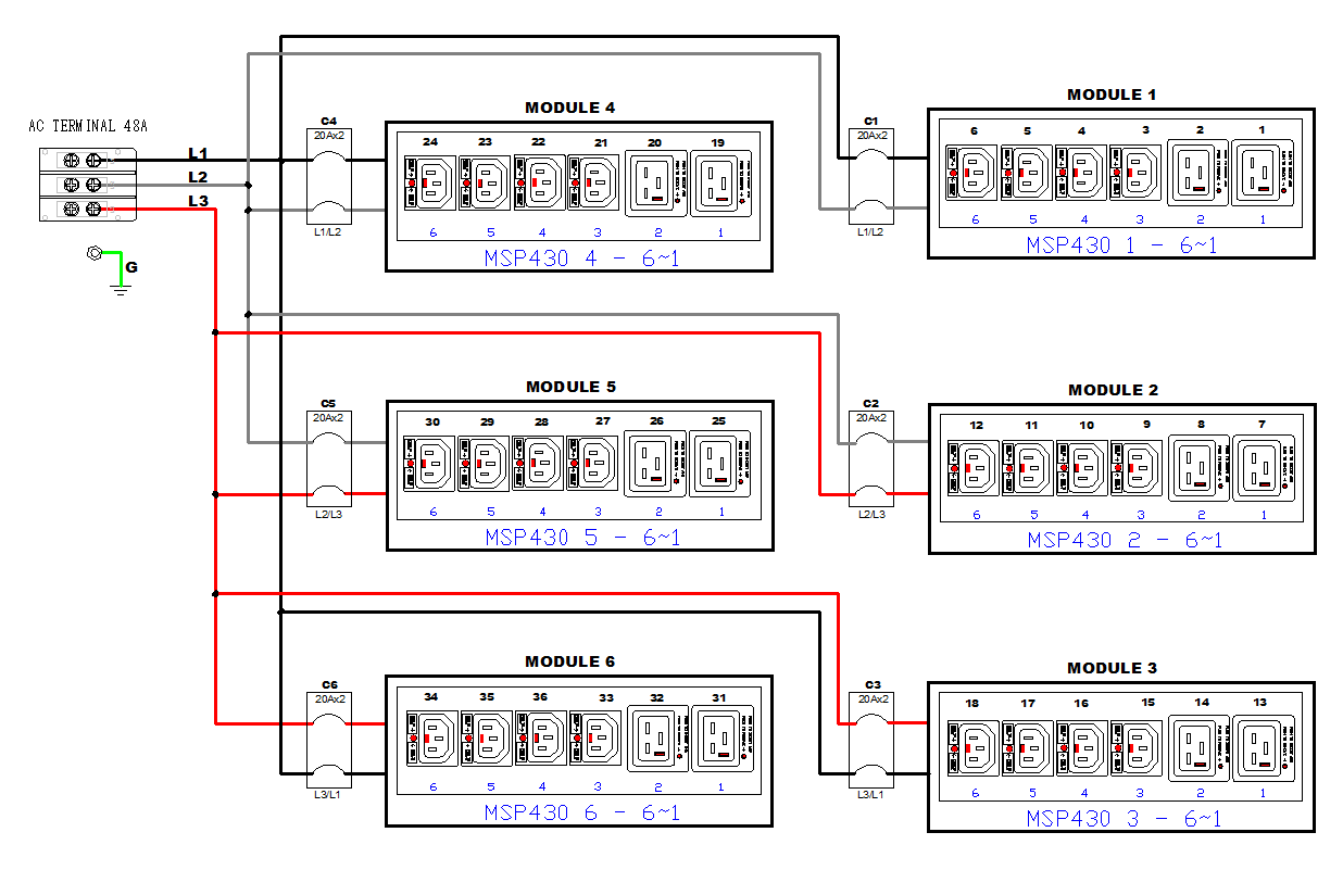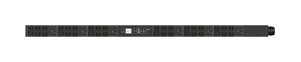 Monitored rack power distribution unit (0U [vertical], 17.3kVA, 36 outlets). INPUT: 208v (3-phase DELTA), 48a - Hardwired [AC Terminal Block, No Cord]; OUTPUT: 24@ C13 Locking, 12@ C19 Locking outlets; on 6@ 2-pole, 20a Overcurrent Protectors; FEATURES: Billing-Grade (+/- 1%) Energy Metering [kW, kVA, V, A, Power Factor] - per inlet, per breaker/fuse, per outlet; Remote network monitoring via HTML, JSON-RPC, SSH, Telnet, MODBUS/TCP, and SNMPv3. Onboard embedded processor with minimum 536MHz clock speed, 16MB SPI Flash, and 64MB DDR2 RAM. Cascading upto 16 PDU's using single Ethernet or USB connection. Environmental monitoring [temp/humidity] capable – up to 32 sensors. Individual outlet numbers labeled on chassis. Automated deployment via TFTP, DHCP, SSH(CLI), or USB Flash Drives. WiFi Capable. USB Webcam Capable. iPad/iPhone/Android App. Dual 10/100/1000 Ethernet port. Tri-color status LED per receptacle. Breaker metering and alarming (0V detection). Max Dimensions 79mm x 89mm x 1650mm (3.1in x 3.5in x 65.0in). Max Weight 8.8 kg. Maximum ambient temperature 60C at full load.
