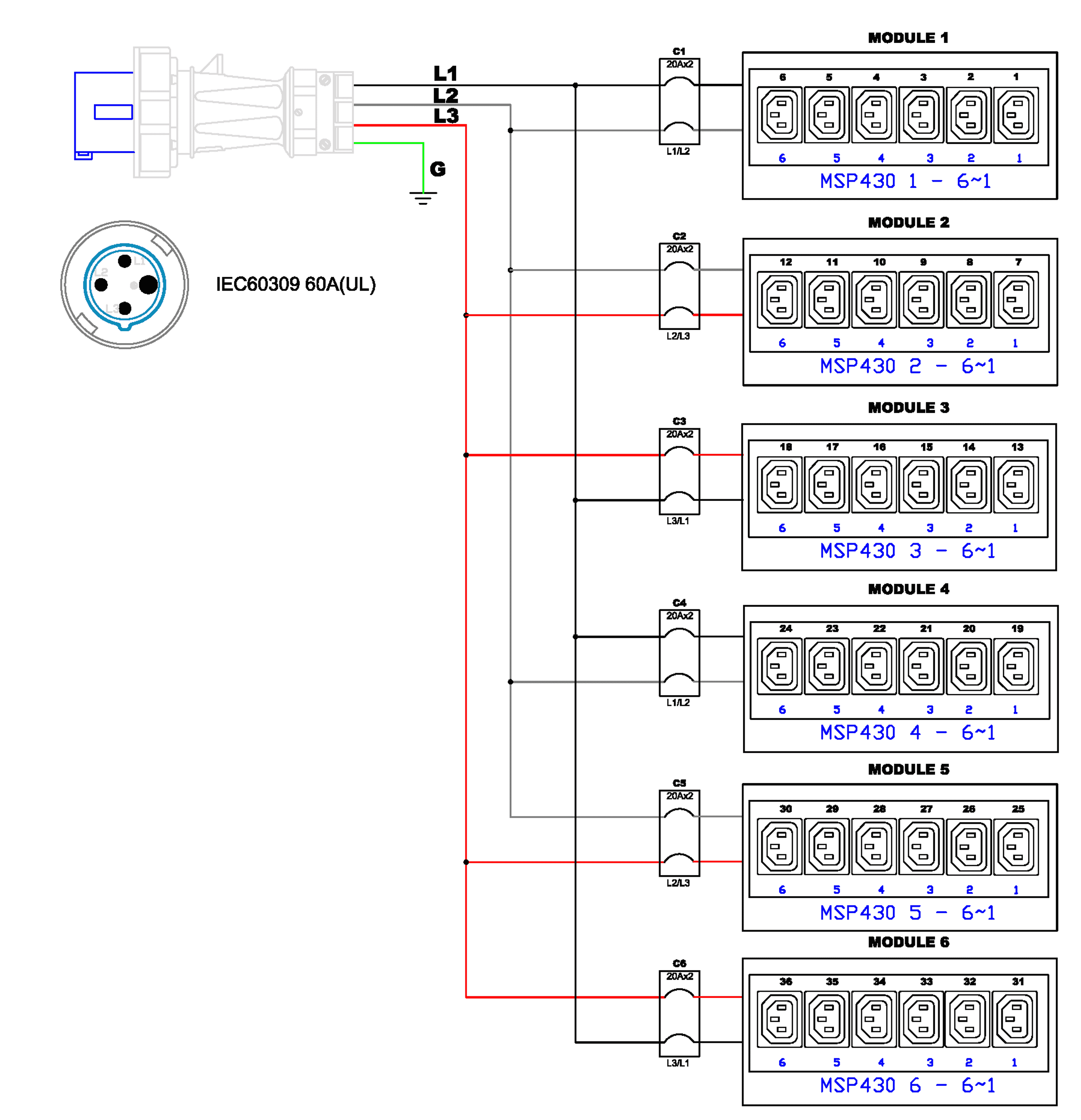3PH, 208V AC, 60A (48A/PH rated); 36 outlets: 36x C13; plug: IEC 60309 3P+E 9h 60A (Delta Bottom-bottom feed), 17.3kVA; Outlet Metered/Switched, Zero U vertical PDU