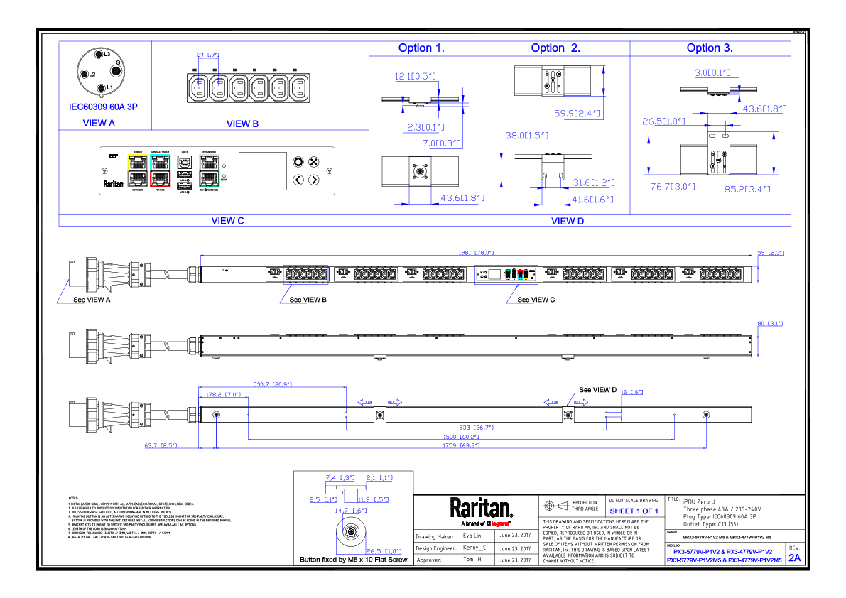 3PH, 208V AC, 60A (48A/PH rated); 36 outlets: 36x C13; plug: IEC 60309 3P+E 9h 60A (Delta Bottom-bottom feed), 17.3kVA; Outlet Metered/Switched, Zero U vertical PDU