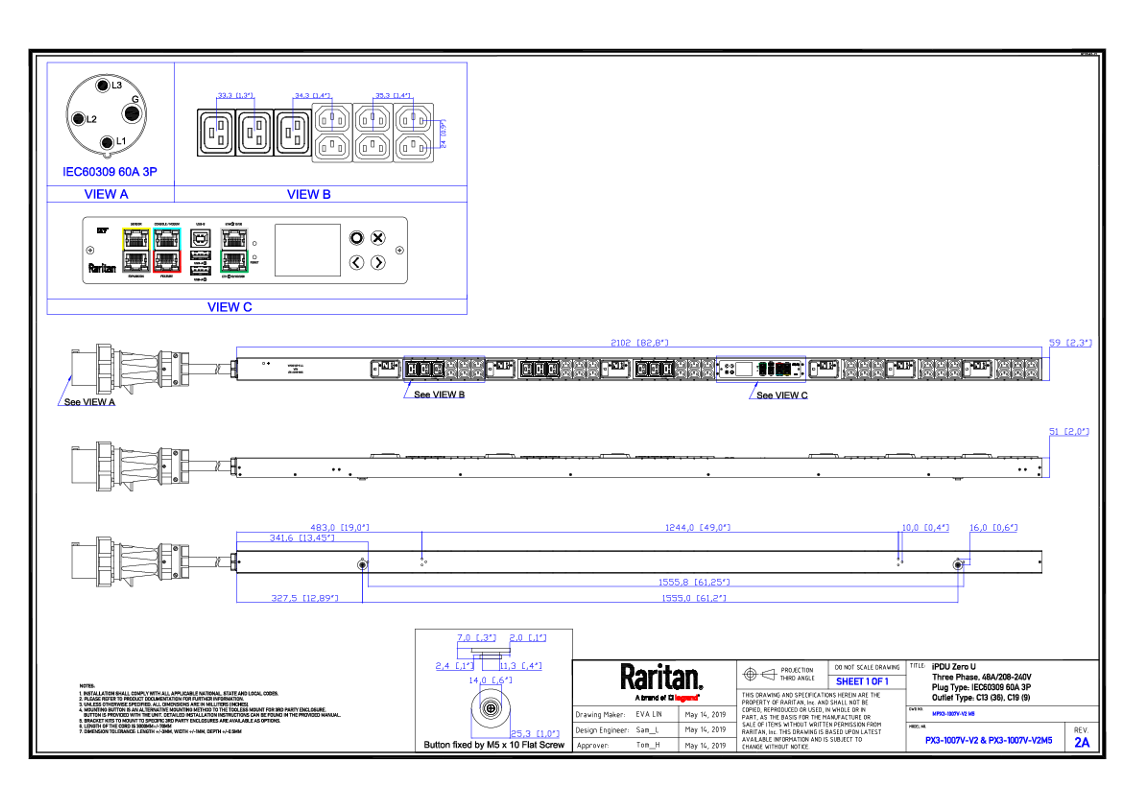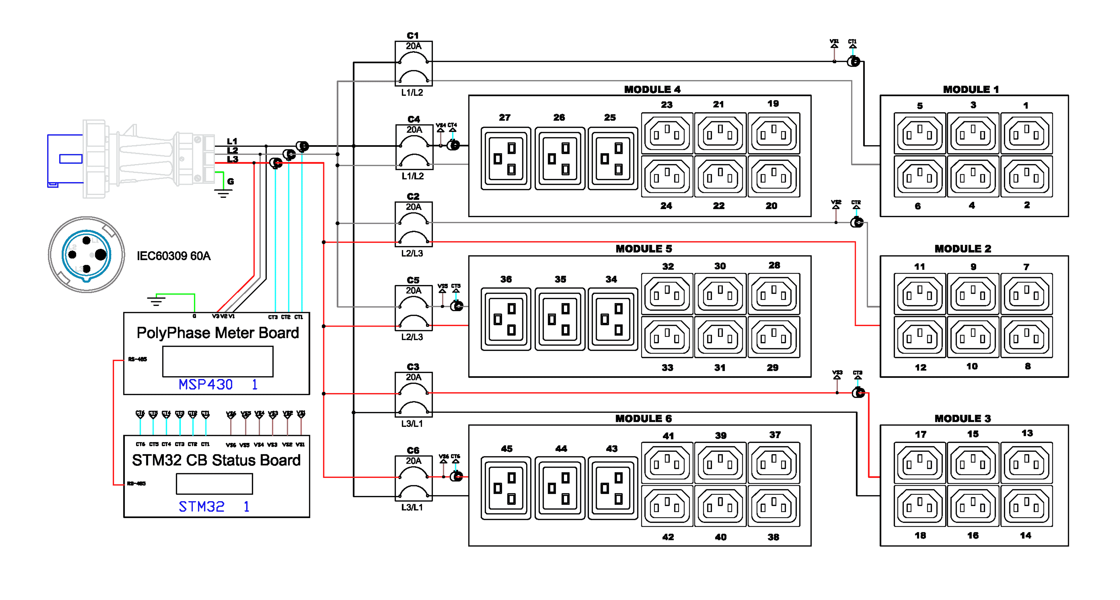 3PH, 208V AC, 60A (48A/PH rated); 45 outlets: 36x C13, 9x C19; plug: IEC 60309 3P+E 9h 60A (Delta Bottom-bottom feed), 17.3kVA; Unit Metered, Zero U vertical PDU