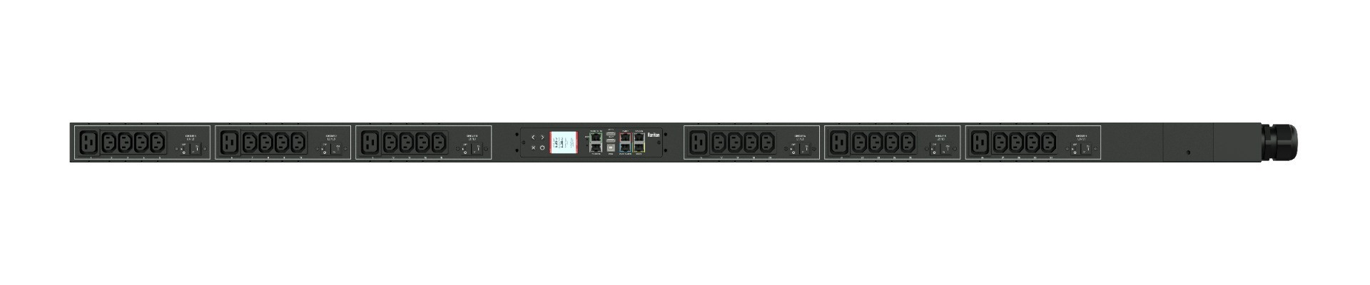 Monitored and switched rack power distribution unit (0U [vertical], 17.3kVA, 48 outlets). INPUT: 208v (3-phase DELTA), 48a - Hardwired [AC Terminal Block, No Cord]; OUTPUT: 36@ C13, 12@ C19 outlets; on 6@ 2-pole, 20a Overcurrent Protectors; FEATURES: Billing-Grade (+/- 1%) Energy Metering [kW, kVA, V, A, Power Factor] - per inlet, per breaker/fuse, per outlet; Remote network monitoring via HTML, JSON-RPC, SSH, Telnet, MODBUS/TCP, and SNMPv3. Onboard embedded processor with minimum 536MHz clock speed, 16MB SPI Flash, and 64MB DDR2 RAM. Cascading upto 16 PDU's using single Ethernet or USB connection. Environmental monitoring [temp/humidity] capable – up to 32 sensors. Individual outlet numbers labeled on chassis. Automated deployment via TFTP, DHCP, SSH(CLI), or USB Flash Drives. WiFi Capable. USB Webcam Capable. iPad/iPhone/Android App. Dual 10/100/1000 Ethernet port. Tri-color status LED per receptacle. Breaker metering and alarming (0V detection). Max Dimensions 89mm x 80mm x 1780mm (3.5in x 3.1in x 70.1in). Max Weight 7.9 kg. Maximum ambient temperature 60C at full load.