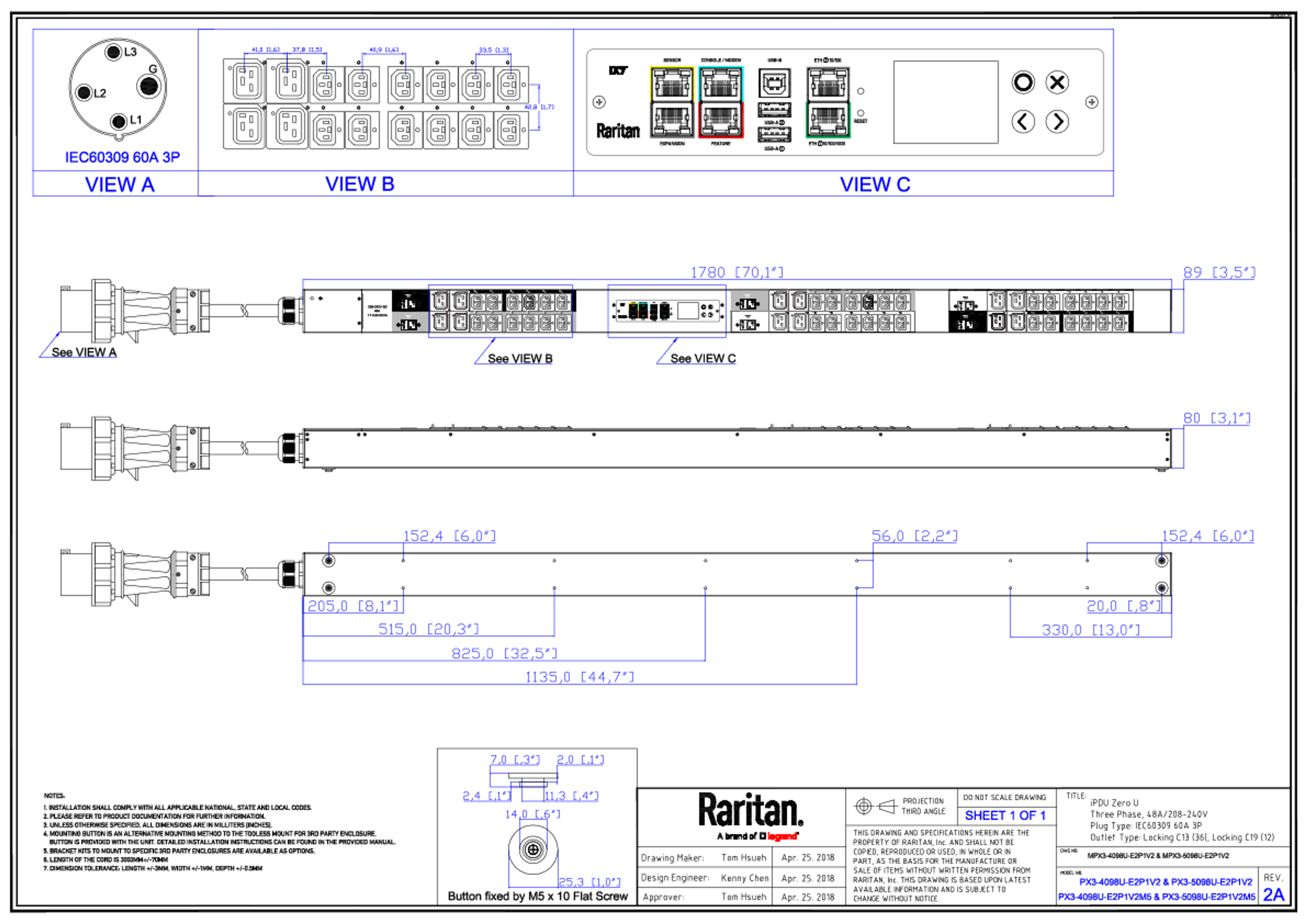 3PH, 208V AC, 60A (48A/PH rated); 48 outlets: 36x C13 Locking, 12x C19 Locking; plug: IEC 60309 3P+E 9h 60A (Delta Top-top feed), 17.3kVA; Outlet Metered, Zero U vertical PDU