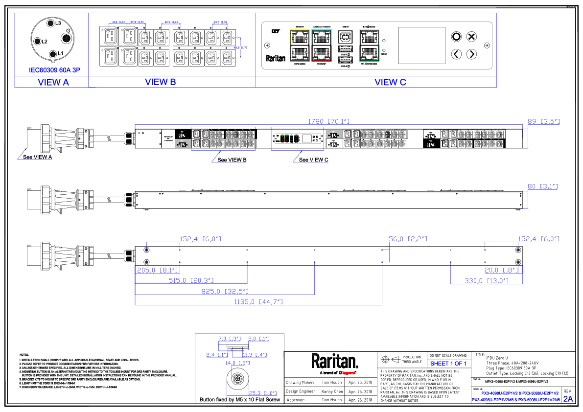 3PH, 208V AC, 60A (48A/PH rated); 48 outlets: 36x C13 Locking, 12x C19 Locking; plug: IEC 60309 3P+E 9h 60A (Delta Top-top feed), 17.3kVA; Outlet Metered, Zero U vertical PDU