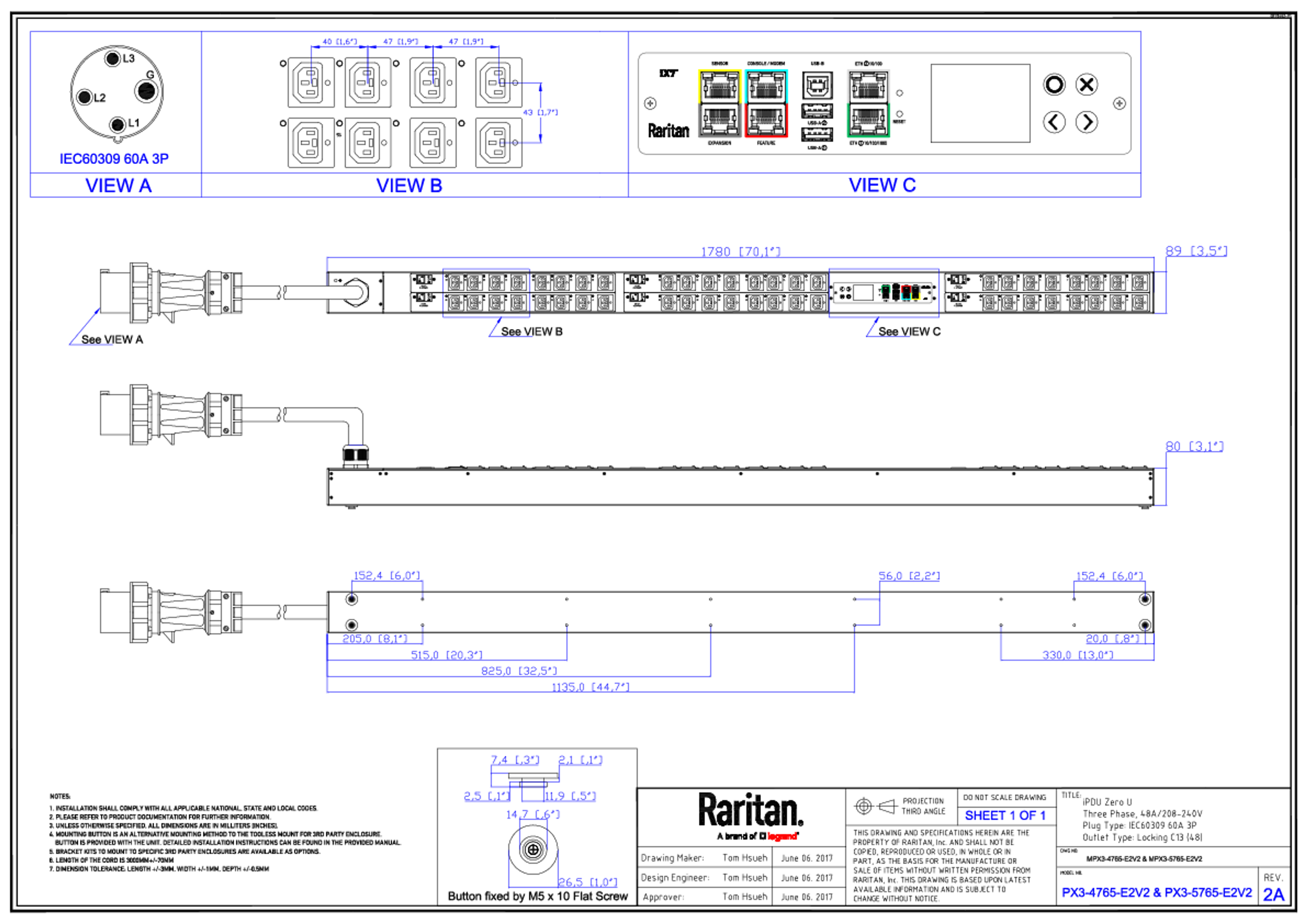 3PH, 208V AC, 60A (48A/PH rated); 48 outlets: 48x C13 Locking; plug: IEC 60309 3P+E 9h 60A (Delta Bottom-front feed), 17.3kVA; Outlet Metered/Switched, Zero U vertical PDU