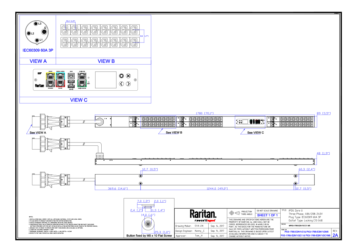 3PH, 208V AC, 60A (48A/PH rated); 48 outlets: 48x C13 Locking; plug: IEC 60309 3P+E 9h 60A (Delta Bottom-front feed), 17.3kVA; Unit Metered, Zero U vertical PDU