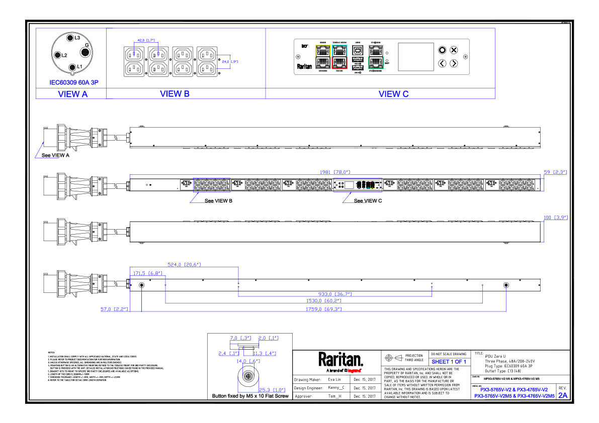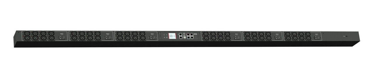 Monitored and switched rack power distribution unit (0U [vertical], 17.3kVA, 48 outlets). INPUT: 208v (3-phase DELTA), 60a - IEC 60309 3P+E 9h 60A plug (3P4W); OUTPUT: 48@ C13 outlets; on 6@ 2-pole, 20a Overcurrent Protectors; FEATURES: Billing-Grade (+/- 1%) Energy Metering [kW, kVA, V, A, Power Factor] - per inlet, per breaker/fuse, per outlet; Remote network monitoring via HTML, JSON-RPC, SSH, Telnet, MODBUS/TCP, and SNMPv3. Onboard embedded processor with minimum 536MHz clock speed, 16MB SPI Flash, and 64MB DDR2 RAM. Cascading upto 16 PDU's using single Ethernet or USB connection. Environmental monitoring [temp/humidity] capable – up to 32 sensors. Individual outlet numbers labeled on chassis. Automated deployment via TFTP, DHCP, SSH(CLI), or USB Flash Drives. WiFi Capable. USB Webcam Capable. iPad/iPhone/Android App. Dual 10/100/1000 Ethernet port. Tri-color status LED per receptacle. Breaker metering and alarming (0V detection). Max Dimensions 59mm x 100mm x 1981mm (2.3in x 3.9in x 78.0in). Max Weight 16.2 kg. Maximum ambient temperature 60C at full load.