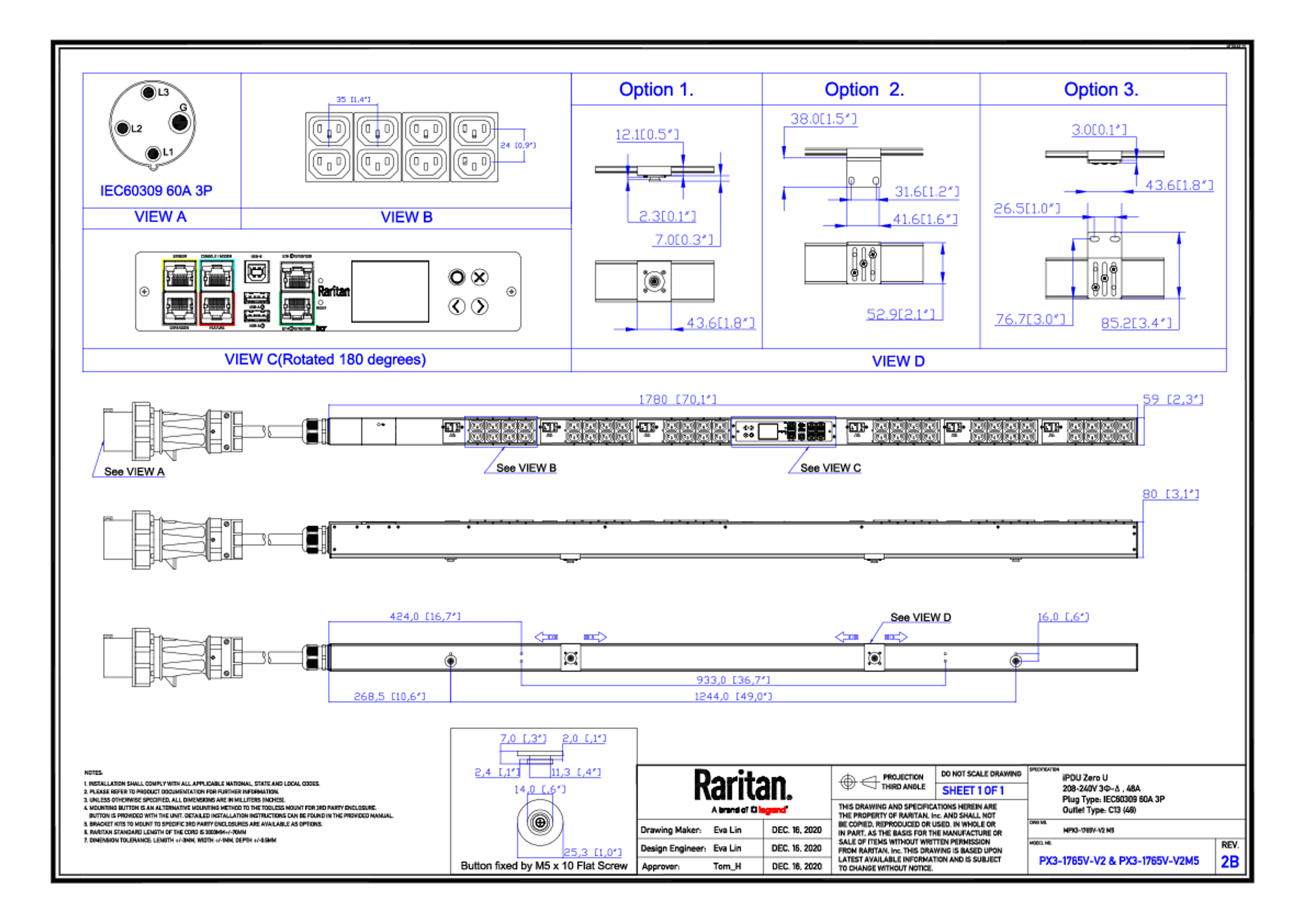 3PH, 208V AC, 60A (48A/PH rated); 48 outlets: 48x C13; plug: IEC 60309 3P+E 9h 60A (Delta Bottom-bottom feed), 17.3kVA; Unit Metered, Zero U vertical PDU