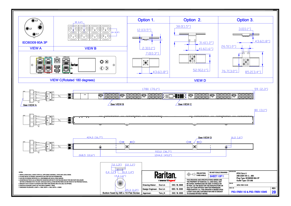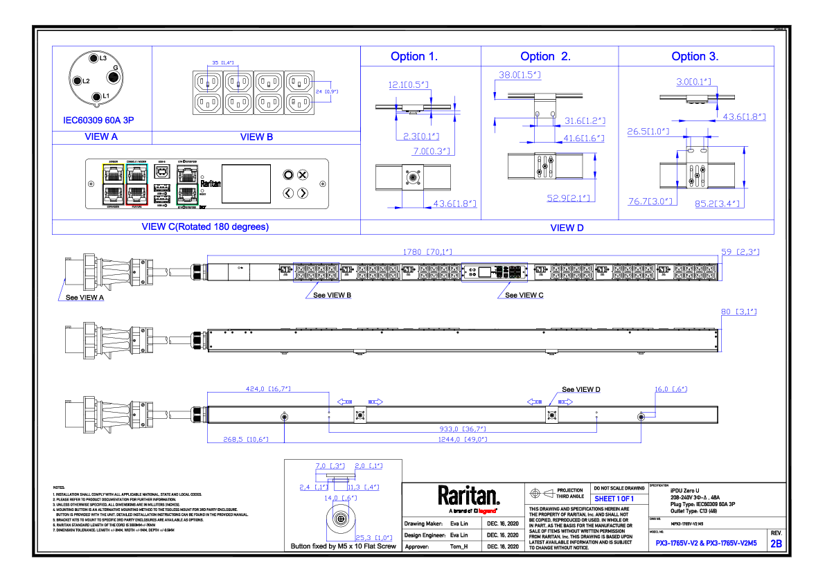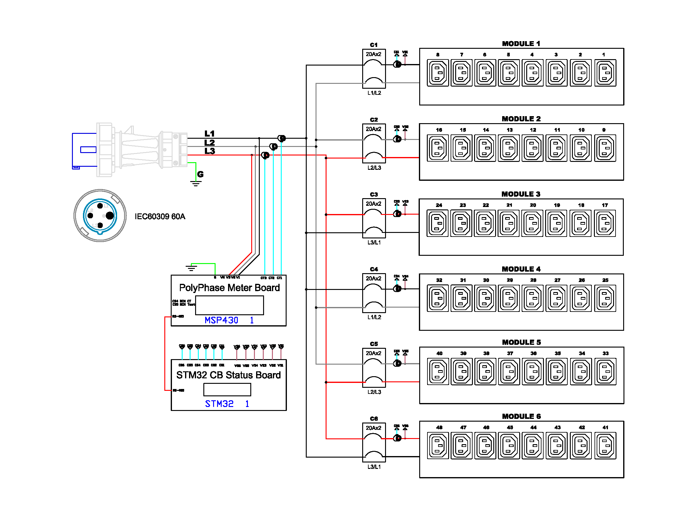 3PH, 208V AC, 60A (48A/PH rated); 48 outlets: 48x C13; plug: IEC 60309 3P+E 9h 60A (Delta Bottom-bottom feed), 17.3kVA; Unit Metered, Zero U vertical PDU
