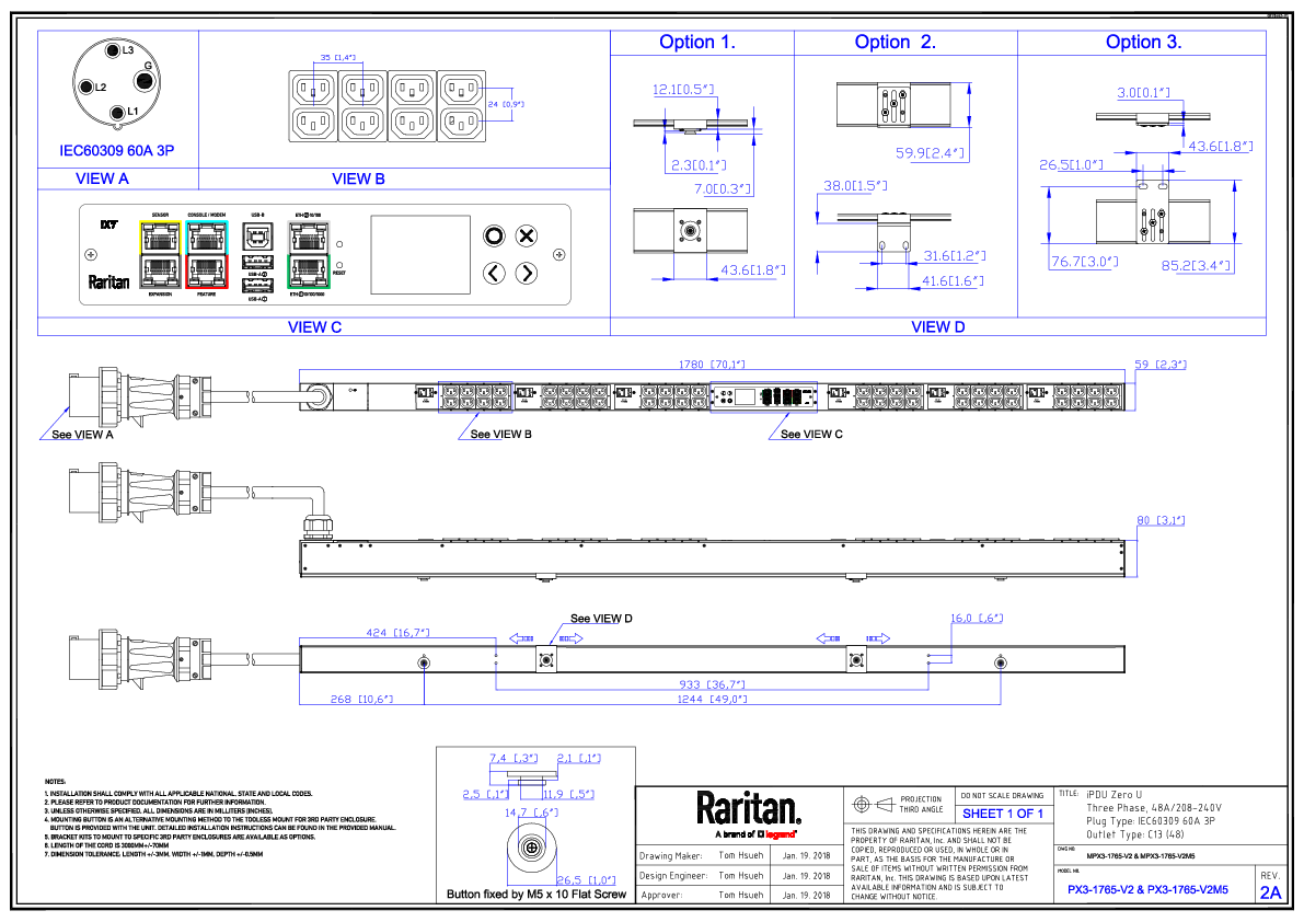 Monitored rack power distribution unit (0U [vertical], 17.3kVA, 48 outlets). INPUT: 208v (3-phase DELTA), 60a - IEC 60309 3P+E 9h 60A plug (3P4W); OUTPUT: 48@ C13 outlets; on 6@ 2-pole, 20a Overcurrent Protectors; FEATURES: Billing-Grade (+/- 1%) Energy Metering [kW, kVA, V, A, Power Factor] - per inlet, per breaker/fuse; Remote network monitoring via HTML, JSON-RPC, SSH, Telnet, MODBUS/TCP, and SNMPv3. Onboard embedded processor with minimum 536MHz clock speed, 16MB SPI Flash, and 64MB DDR2 RAM. Cascading upto 16 PDU's using single Ethernet or USB connection. Environmental monitoring [temp/humidity] capable – up to 32 sensors. Individual outlet numbers labeled on chassis. Automated deployment via TFTP, DHCP, SSH(CLI), or USB Flash Drives. WiFi Capable. USB Webcam Capable. iPad/iPhone/Android App. Dual 10/100/1000 Ethernet port. Breaker metering and alarming (0V detection). Max Dimensions 59mm x 80mm x 1780mm (2.3in x 3.1in x 70.1in). Max Weight 11.7 kg. Maximum ambient temperature 60C at full load.