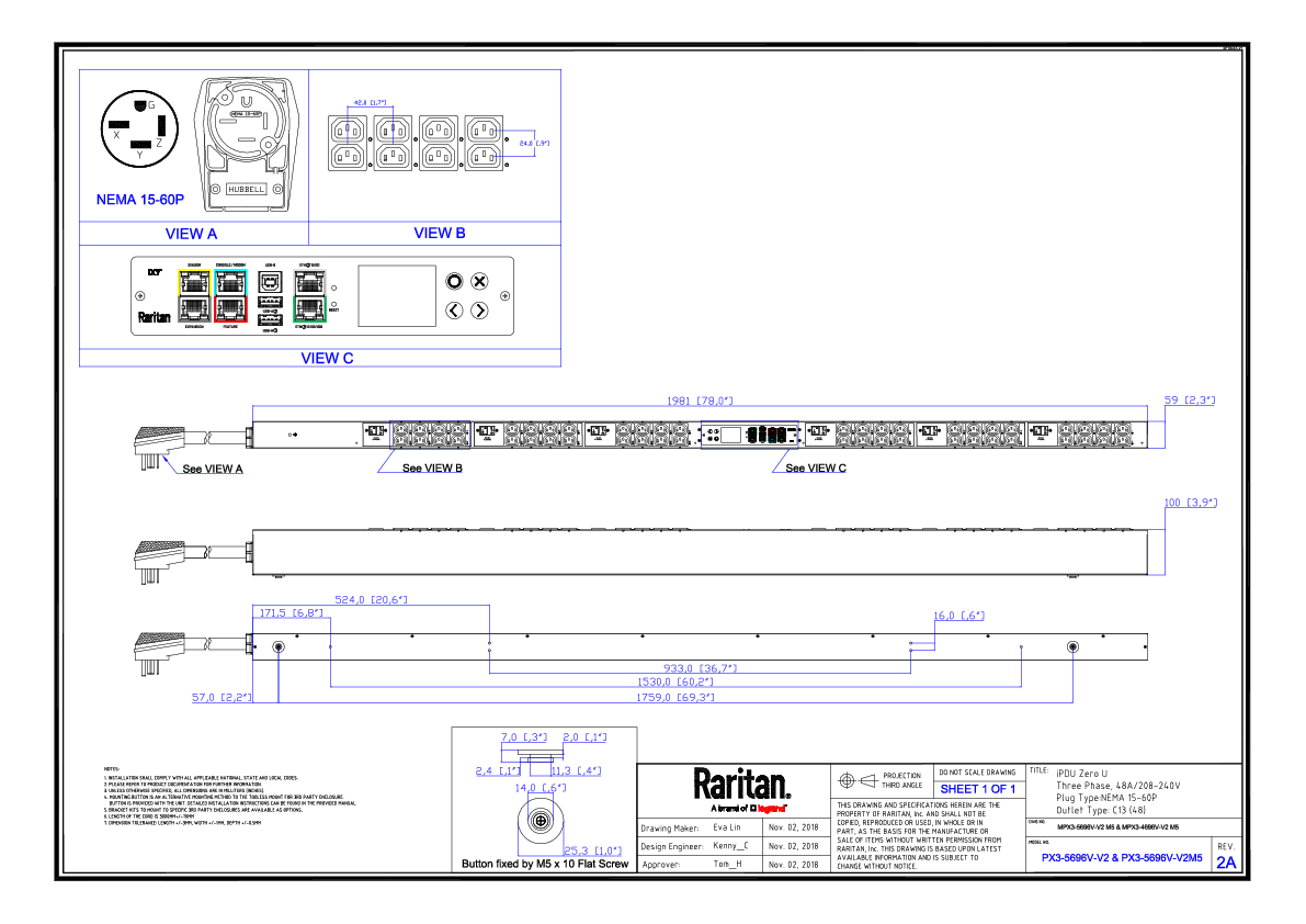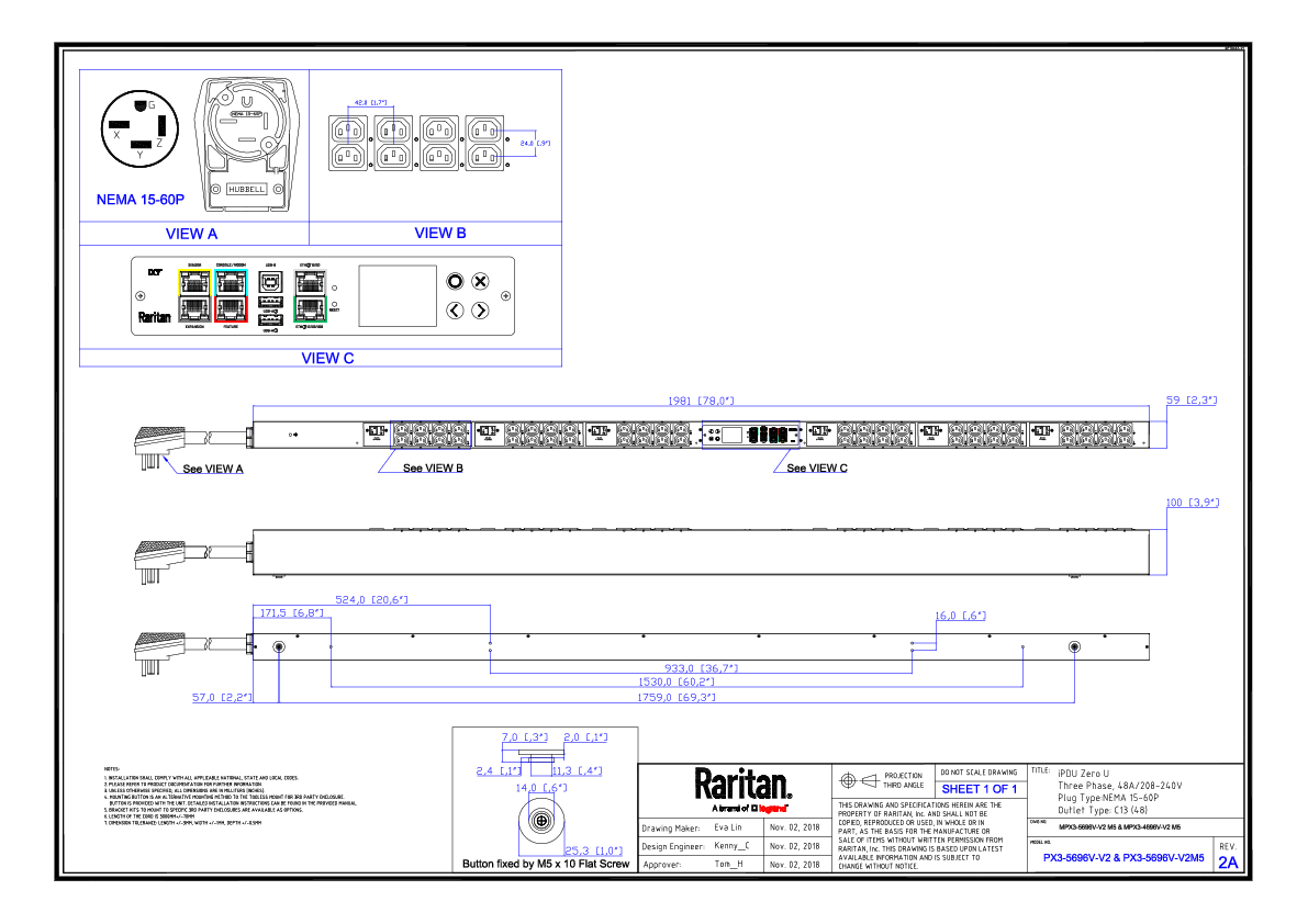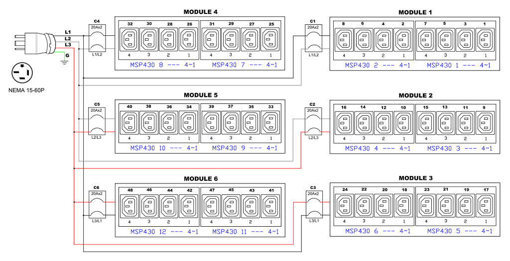 3PH, 208V AC, 60A (48A/PH rated); 48 outlets: 48x C13; plug: NEMA L15-60P (Delta Bottom-bottom feed), 17.3kVA; Outlet Metered/Switched, Zero U vertical PDU
