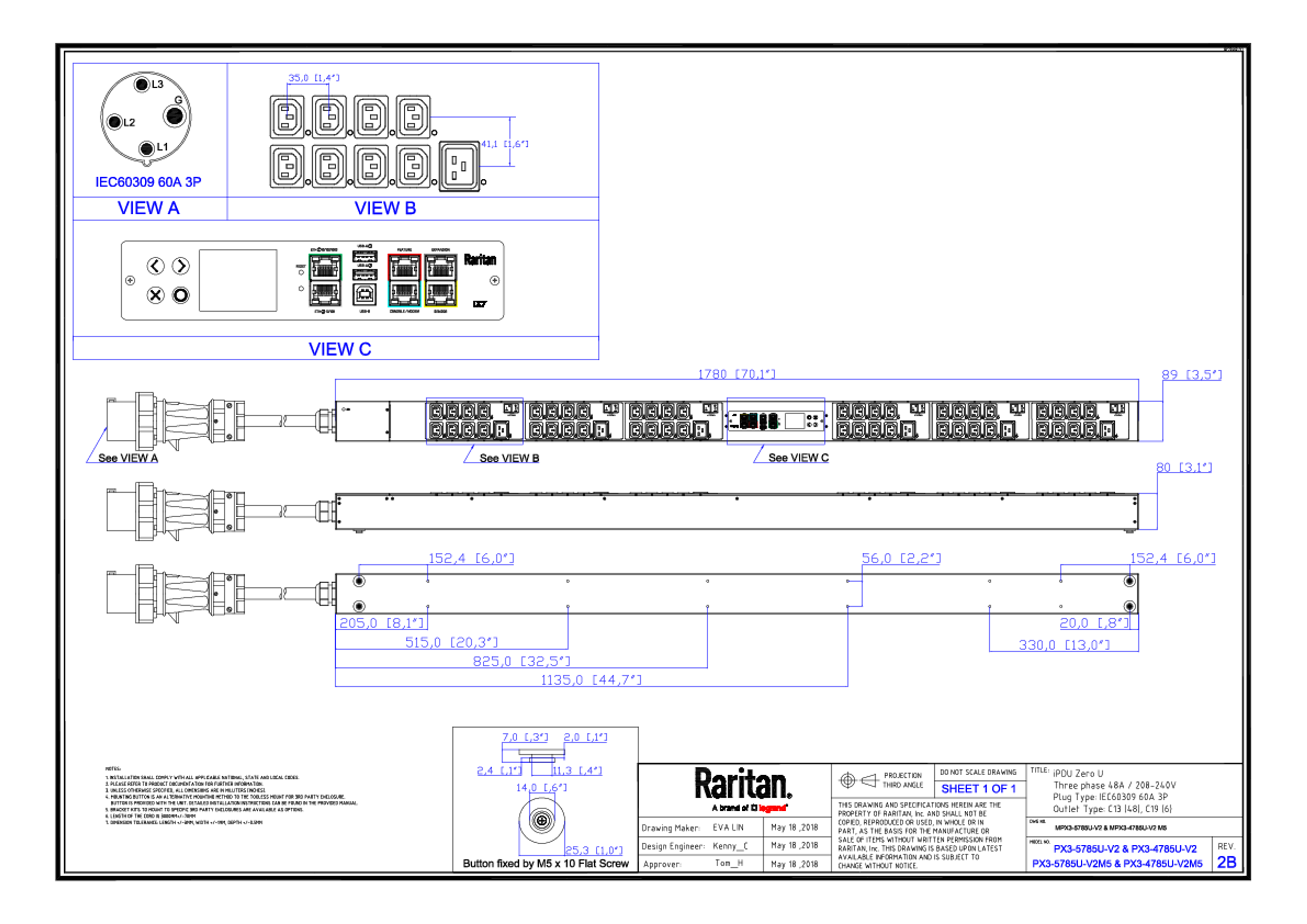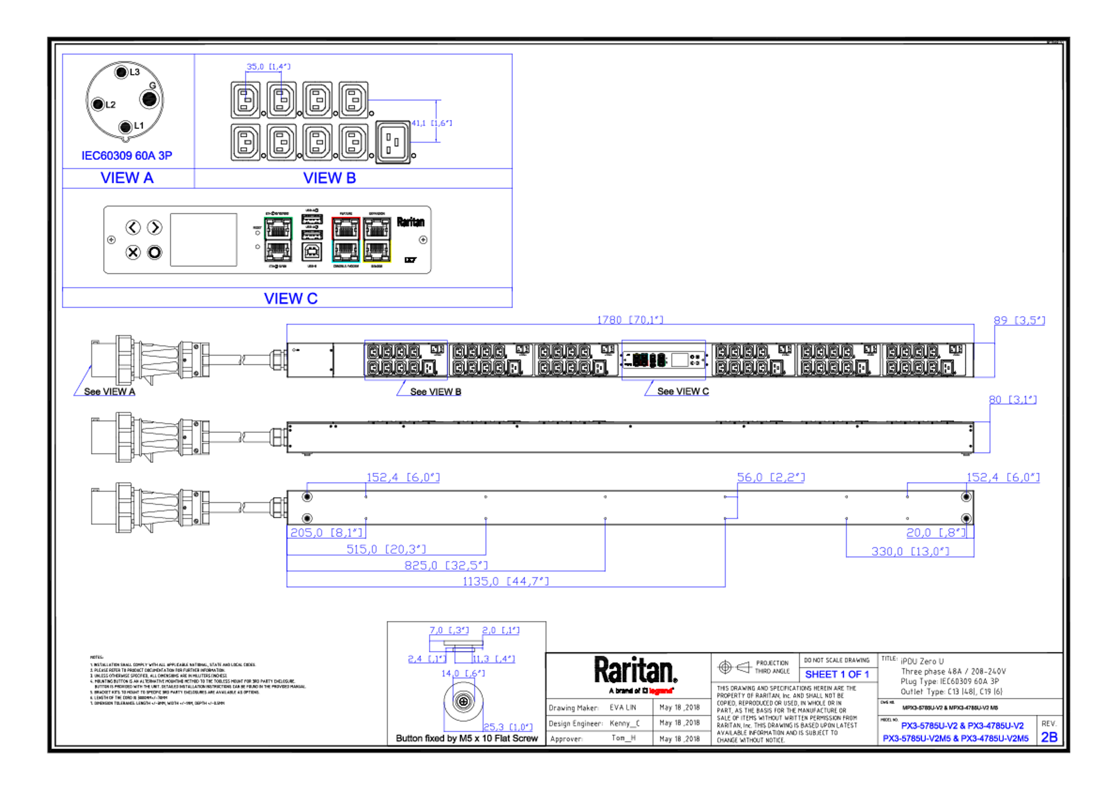 3PH, 208V AC, 60A (48A/PH rated); 54 outlets: 48x C13, 6x C19; plug: IEC 60309 3P+E 9h 60A (Delta Top-top feed), 17.3kVA; Outlet Metered/Switched, Zero U vertical PDU