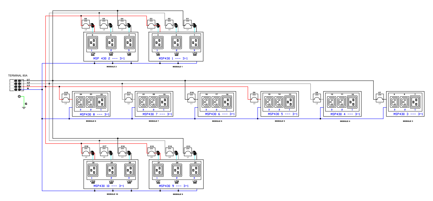 3PH, 400V AC, 100A (80A/PH rated); 30 outlets: 12x C13, 18x C19; plug: AC Terminal (Wye Top-top feed), 55.4kVA; Outlet Metered, Zero U vertical PDU