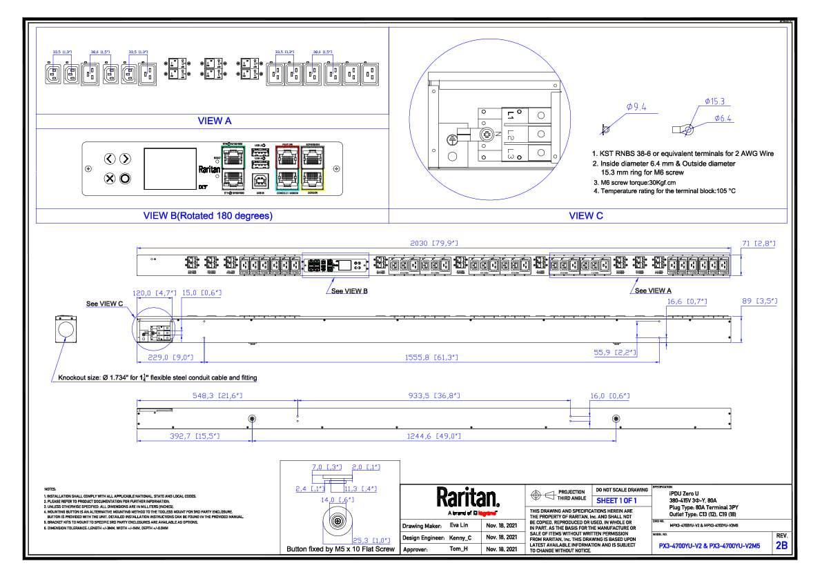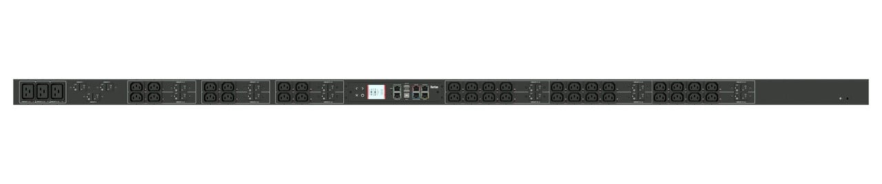 Monitored rack power distribution unit (0U [vertical], 57.5kVA, 30 outlets). INPUT: 415v (3-phase WYE), 80a - Hardwired [AC Terminal Block, No Cord]; OUTPUT: 12@ C13, 18@ C19 outlets; on 18@ 1-pole, 20a Overcurrent Protectors; FEATURES: Billing-Grade (+/- 1%) Energy Metering [kW, kVA, V, A, Power Factor] - per inlet, per breaker/fuse, per outlet; Remote network monitoring via HTML, JSON-RPC, SSH, Telnet, MODBUS/TCP, and SNMPv3. Onboard embedded processor with minimum 536MHz clock speed, 16MB SPI Flash, and 64MB DDR2 RAM. Cascading upto 16 PDU's using single Ethernet or USB connection. Environmental monitoring [temp/humidity] capable – up to 32 sensors. Individual outlet numbers labeled on chassis. Automated deployment via TFTP, DHCP, SSH(CLI), or USB Flash Drives. WiFi Capable. USB Webcam Capable. iPad/iPhone/Android App. Dual 10/100/1000 Ethernet port. Tri-color status LED per receptacle. Breaker metering and alarming (0V detection). Max Dimensions 71mm x 89mm x 2030mm (2.8in x 3.5in x 79.9in). Max Weight 12 kg. Maximum ambient temperature 60C at full load.