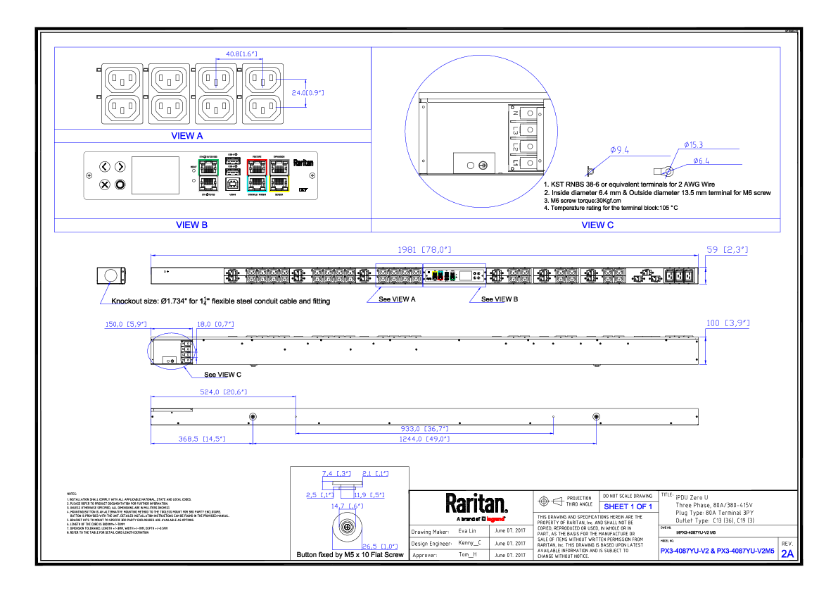 Monitored rack power distribution unit (0U [vertical], 57.5kVA, 39 outlets). INPUT: 415v (3-phase WYE), 80a - Hardwired [AC Terminal Block, No Cord]; OUTPUT: 36@ C13, 3@ C19 outlets; on 15@ 1-pole, 20a Overcurrent Protectors; FEATURES: Billing-Grade (+/- 1%) Energy Metering [kW, kVA, V, A, Power Factor] - per inlet, per breaker/fuse, per outlet; Remote network monitoring via HTML, JSON-RPC, SSH, Telnet, MODBUS/TCP, and SNMPv3. Onboard embedded processor with minimum 536MHz clock speed, 16MB SPI Flash, and 64MB DDR2 RAM. Cascading upto 16 PDU's using single Ethernet or USB connection. Environmental monitoring [temp/humidity] capable – up to 32 sensors. Individual outlet numbers labeled on chassis. Automated deployment via TFTP, DHCP, SSH(CLI), or USB Flash Drives. WiFi Capable. USB Webcam Capable. iPad/iPhone/Android App. Dual 10/100/1000 Ethernet port. Tri-color status LED per receptacle. Breaker metering and alarming (0V detection). Max Dimensions 59mm x 100mm x 1981mm (2.3in x 3.9in x 78.0in). Max Weight 11.4 kg. Maximum ambient temperature 60C at full load.