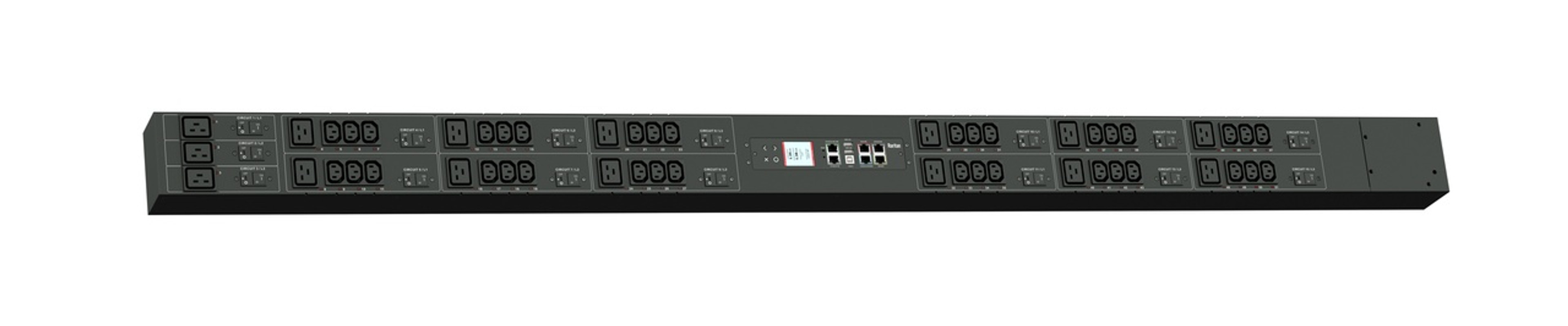 Monitored rack power distribution unit (0U [vertical], 57.5kVA, 51 outlets). INPUT: 415v (3-phase WYE), 80a - Hardwired [AC Terminal Block, No Cord]; OUTPUT: 36@ C13, 15@ C19 outlets; on 15@ 1-pole, 20a Overcurrent Protectors; FEATURES: Billing-Grade (+/- 1%) Energy Metering [kW, kVA, V, A, Power Factor] - per inlet, per breaker/fuse, per outlet; Remote network monitoring via HTML, JSON-RPC, SSH, Telnet, MODBUS/TCP, and SNMPv3. Onboard embedded processor with minimum 536MHz clock speed, 16MB SPI Flash, and 64MB DDR2 RAM. Cascading upto 16 PDU's using single Ethernet or USB connection. Environmental monitoring [temp/humidity] capable – up to 32 sensors. Individual outlet numbers labeled on chassis. Automated deployment via TFTP, DHCP, SSH(CLI), or USB Flash Drives. WiFi Capable. USB Webcam Capable. iPad/iPhone/Android App. Dual 10/100/1000 Ethernet port. Tri-color status LED per receptacle. Breaker metering and alarming (0V detection). Max Dimensions 109mm x 80mm x 1780mm (4.3in x 3.1in x 70.1in). Max Weight 9.8 kg. Maximum ambient temperature 60C at full load.
