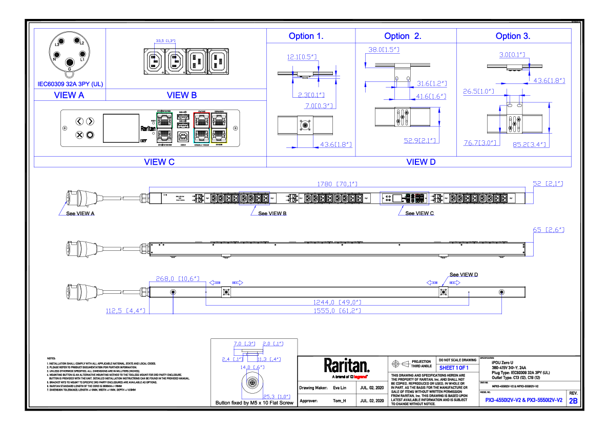 3PH, 400V AC, 30A (24A/PH rated); 24 outlets: 12x C13, 12x C19; plug: IEC 60309 32A 6H (Wye Bottom-bottom feed), 16.6kVA; Outlet Metered, Zero U vertical PDU