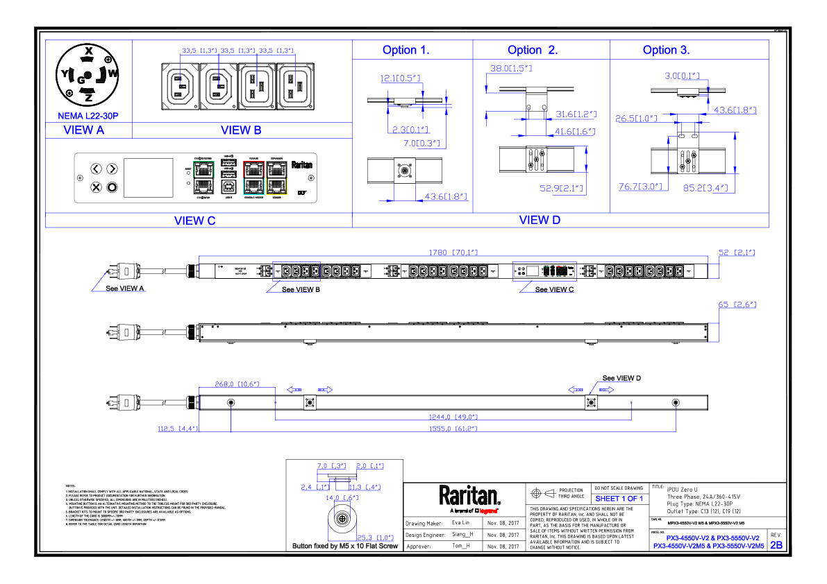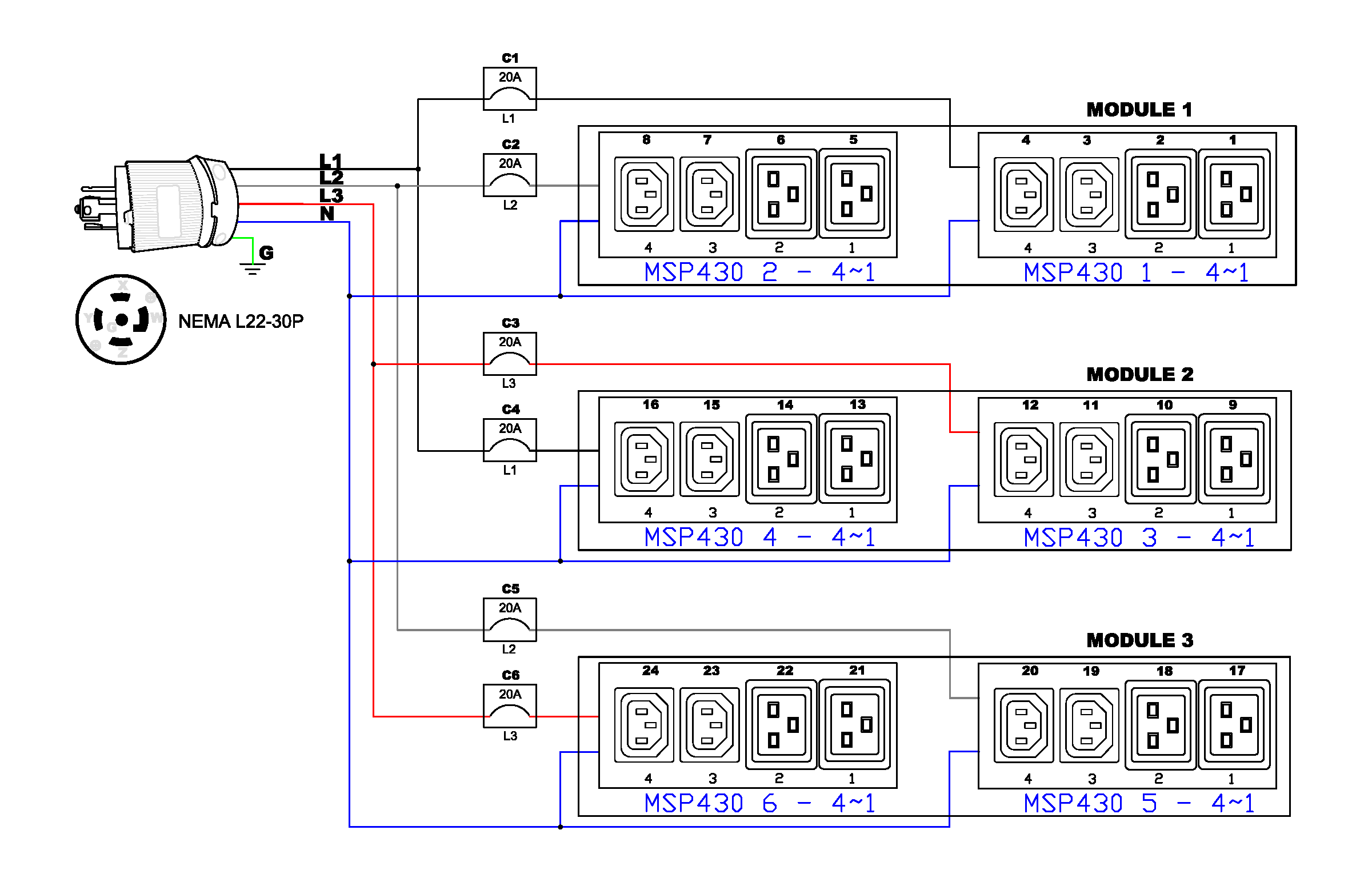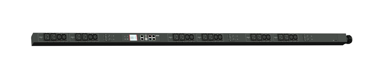 3PH, 400V AC, 30A (24A/PH rated); 24 outlets: 12x C13, 12x C19; plug: NEMA L22-30P (Wye Bottom-bottom feed), 16.6kVA; Outlet Metered, Zero U vertical PDU