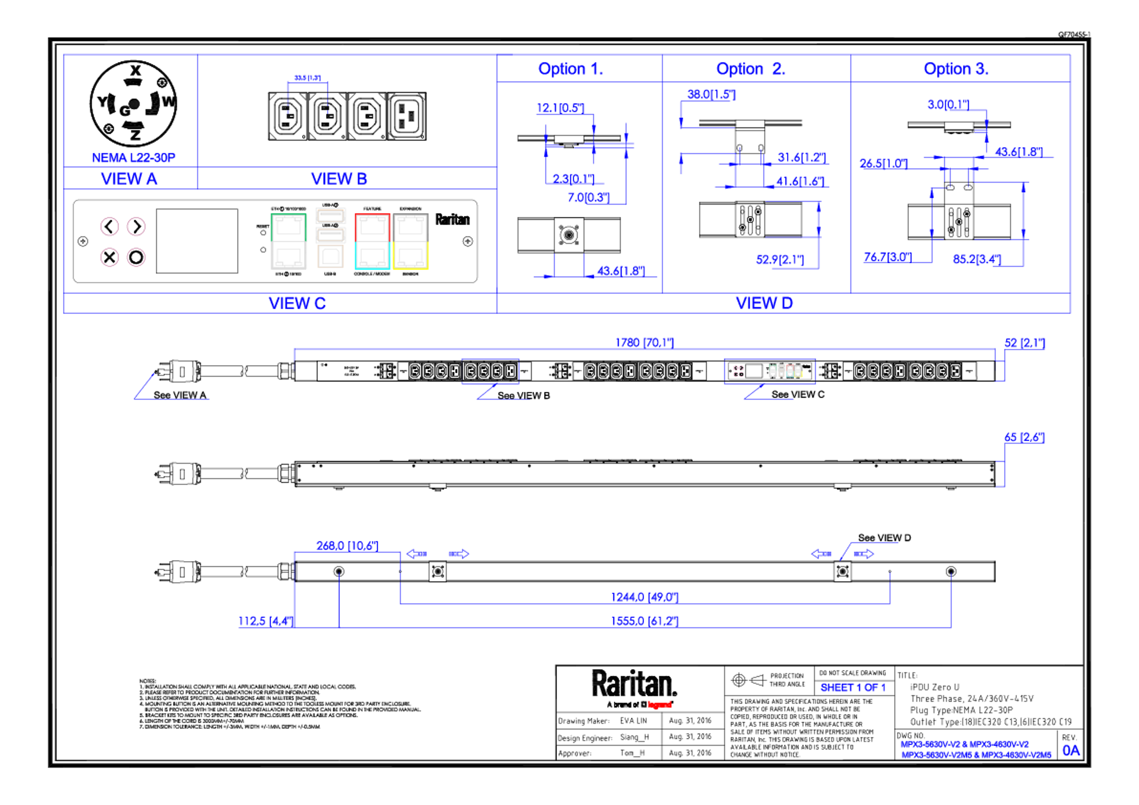 3PH, 400V AC, 30A (24A/PH rated); 24 outlets: 18x C13, 6x C19; plug: NEMA L22-30P (Wye Bottom-bottom feed), 16.6kVA; Outlet Metered/Switched, Zero U vertical PDU