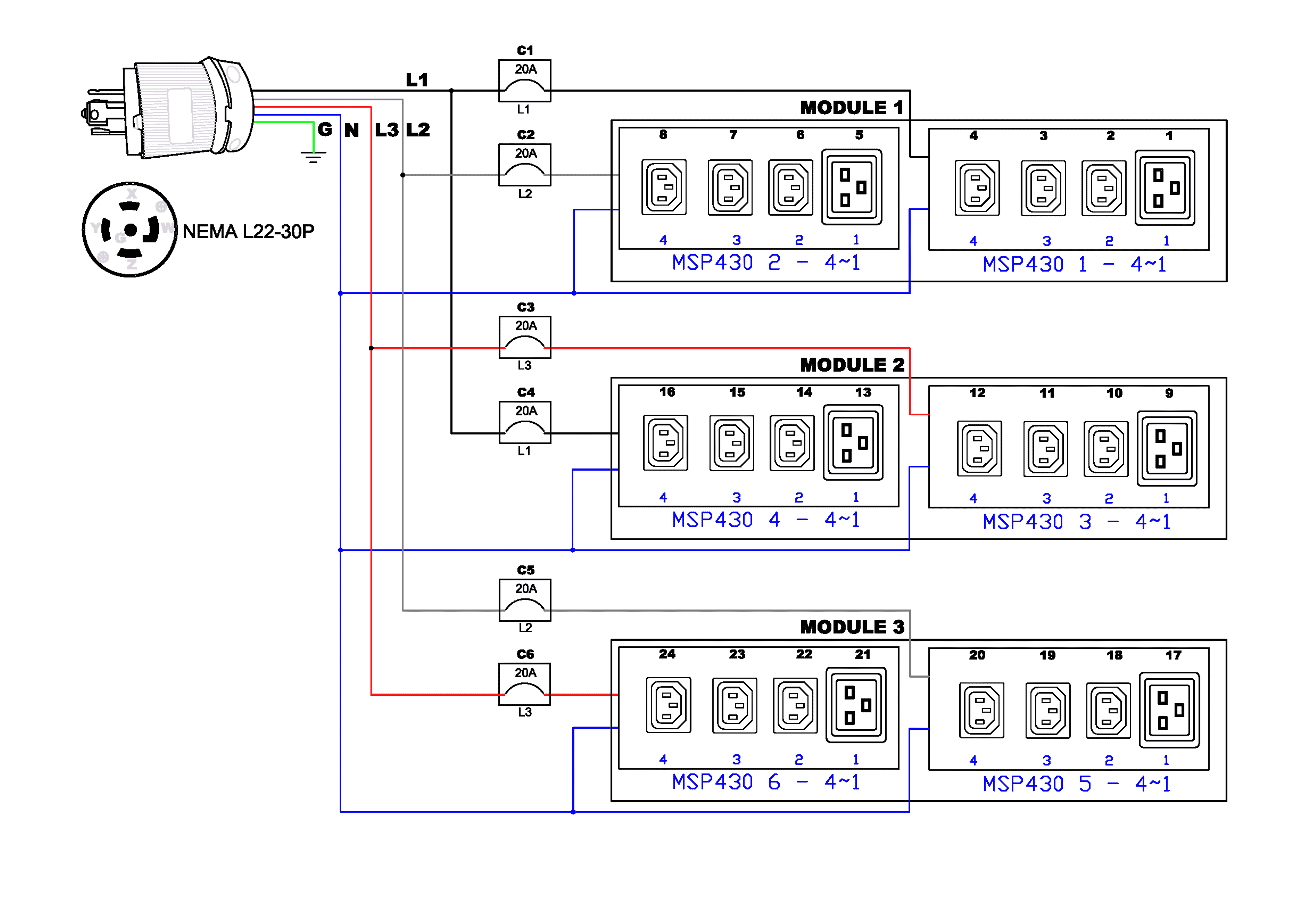 3PH, 400V AC, 30A (24A/PH rated); 24 outlets: 18x C13, 6x C19; plug: NEMA L22-30P (Wye Top-top feed), 16.6kVA; Outlet Metered/Switched, Zero U vertical PDU