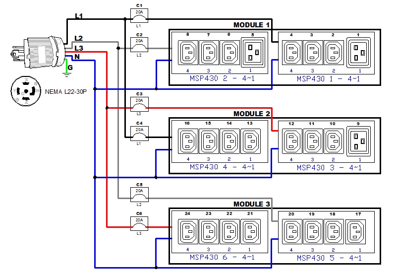 3PH, 400V AC, 30A (24A/PH rated); 24 outlets: 21x C13, 3x C19; plug: NEMA L22-30P (Wye Top-top feed), 16.6kVA; Outlet Metered/Switched, Zero U vertical PDU