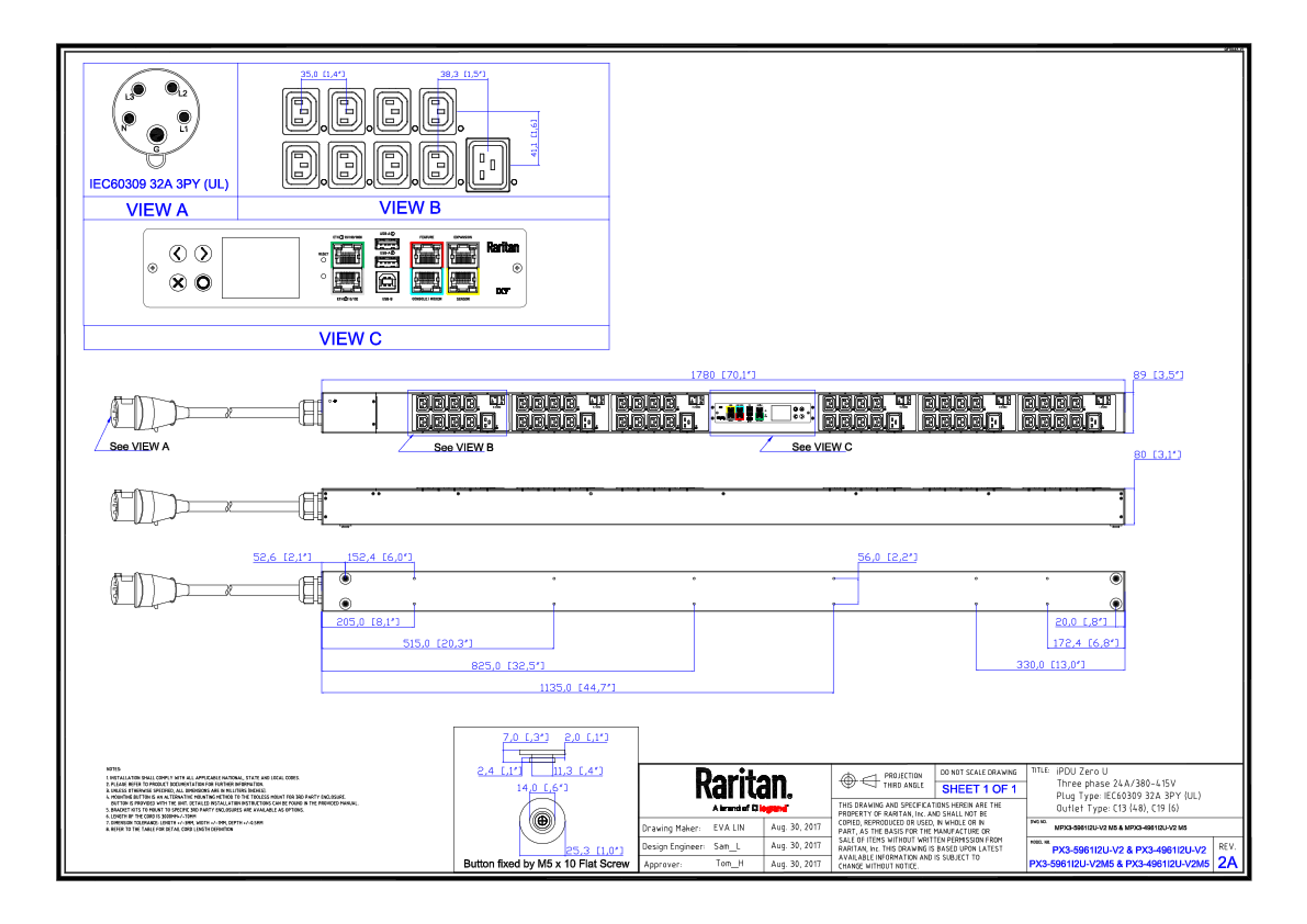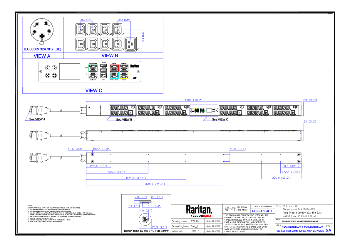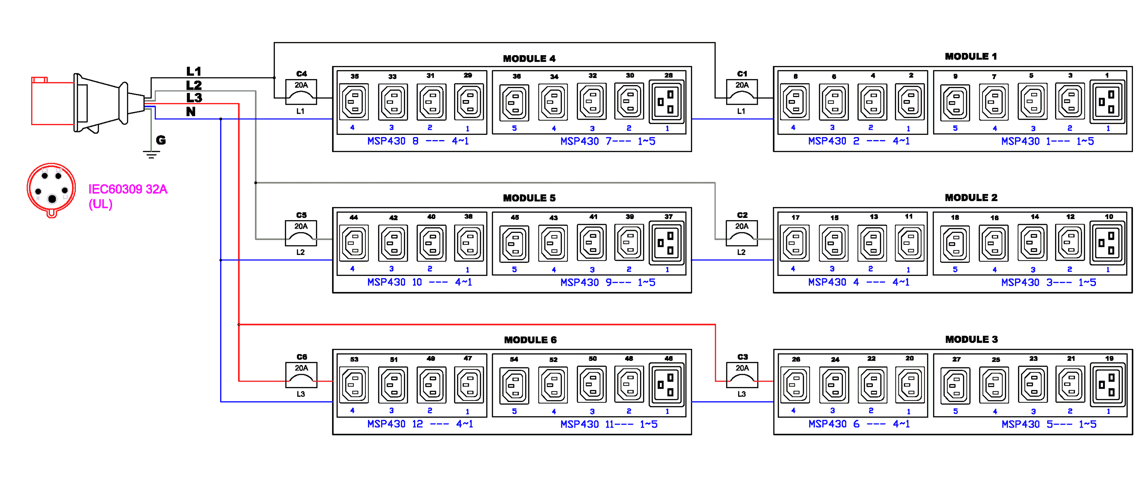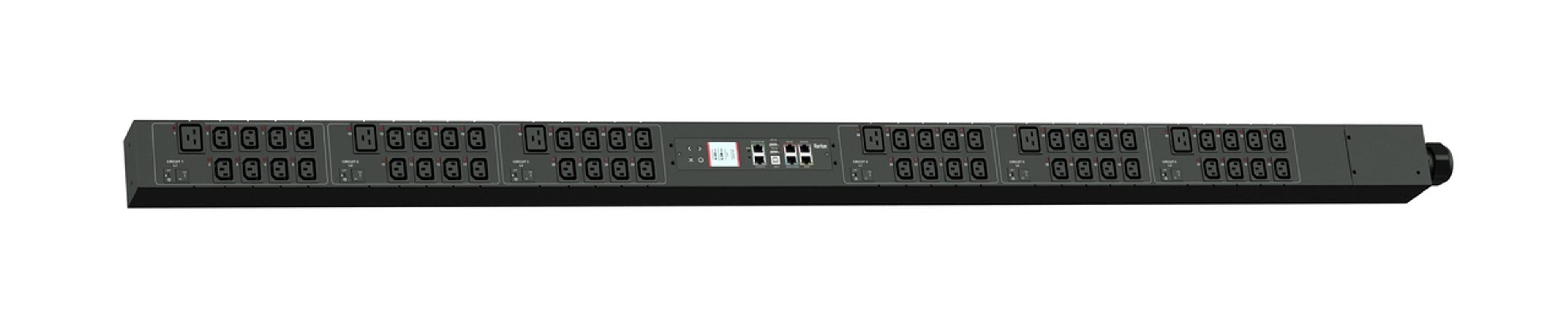 3PH, 400V AC, 32A (24A/PH rated); 54 outlets: 48x C13, 6x C19; plug: IEC 60309 3P+N+E 6h 32A (Wye Top-top feed), 16.6kVA; Outlet Metered/Switched, Zero U vertical PDU