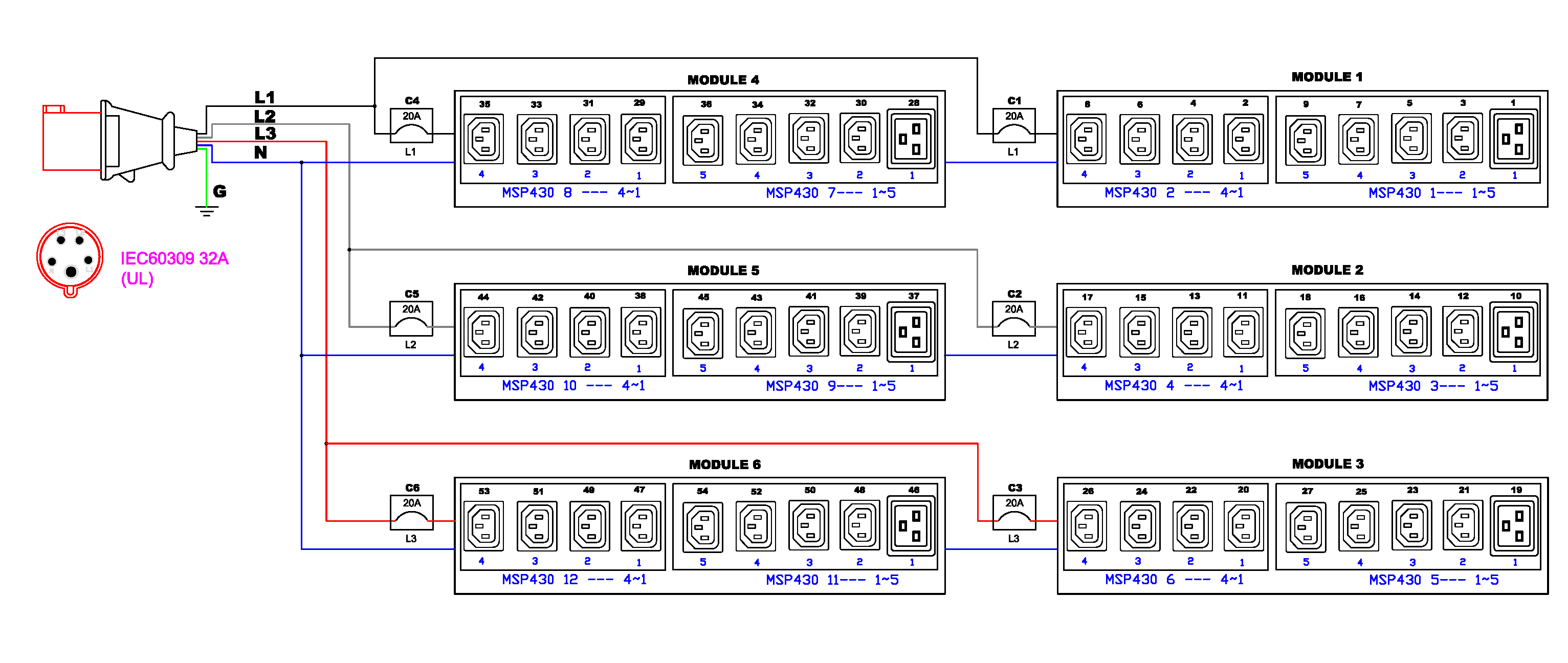 Monitored and switched rack power distribution unit (0U [vertical], 16.6kVA, 54 outlets). INPUT: 400v (3-phase WYE), 32a - IEC 60309 3P+N+E 6h 32A plug (4P5W); OUTPUT: 48@ C13, 6@ C19 outlets; on 6@ 1-pole, 20a Overcurrent Protectors; FEATURES: Billing-Grade (+/- 1%) Energy Metering [kW, kVA, V, A, Power Factor] - per inlet, per breaker/fuse, per outlet; Remote network monitoring via HTML, JSON-RPC, SSH, Telnet, MODBUS/TCP, and SNMPv3. Onboard embedded processor with minimum 536MHz clock speed, 16MB SPI Flash, and 64MB DDR2 RAM. Cascading upto 16 PDU's using single Ethernet or USB connection. Environmental monitoring [temp/humidity] capable – up to 32 sensors. Individual outlet numbers labeled on chassis. Automated deployment via TFTP, DHCP, SSH(CLI), or USB Flash Drives. WiFi Capable. USB Webcam Capable. iPad/iPhone/Android App. Dual 10/100/1000 Ethernet port. Tri-color status LED per receptacle. Breaker metering and alarming (0V detection). Max Dimensions 89mm x 80mm x 1780mm (3.5in x 3.1in x 70.1in). Max Weight TBD. Maximum ambient temperature 60C at full load.