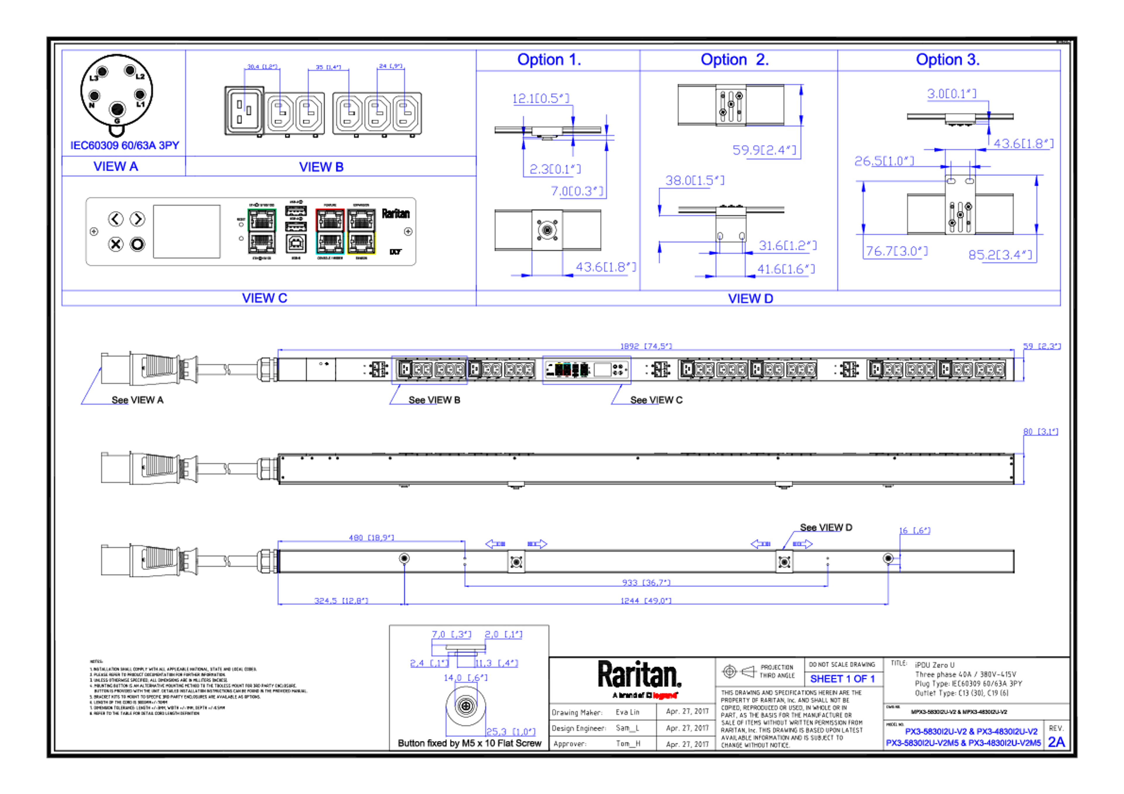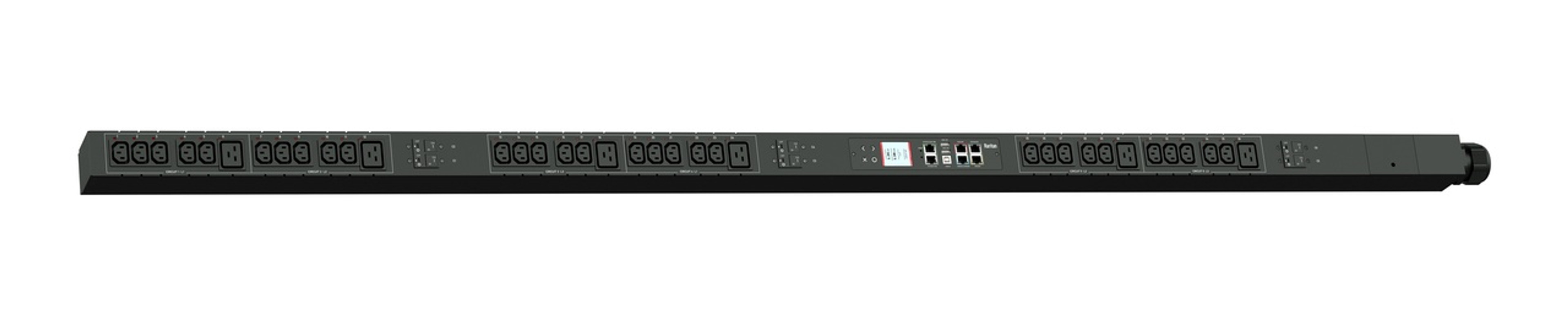 3PH, 400V AC, 60A (40A/PH rated); 36 outlets: 30x C13, 6x C19; plug: IEC 60309 3P+N+E 6h 60A (Wye Top-top feed), 27.7kVA; Outlet Metered/Switched, Zero U vertical PDU