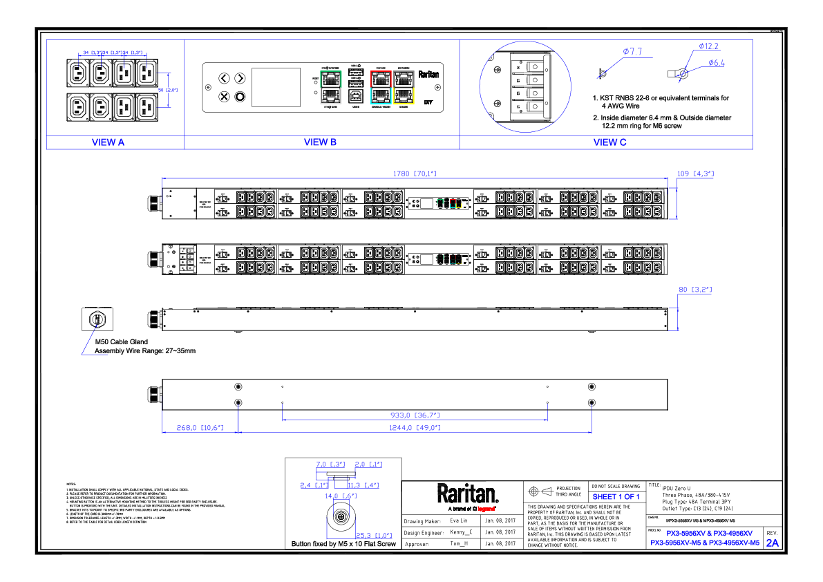 Monitored and switched rack power distribution unit (0U [vertical], 33.3kVA, 48 outlets). INPUT: 400v (3-phase WYE), 48a - Hardwired [AC Terminal Block, No Cord]; OUTPUT: 24@ C13, 24@ C19 outlets; on 12@ 1-pole, 20a Overcurrent Protectors; FEATURES: Billing-Grade (+/- 1%) Energy Metering [kW, kVA, V, A, Power Factor] - per inlet, per breaker/fuse, per outlet; Remote network monitoring via HTML, JSON-RPC, SSH, Telnet, MODBUS/TCP, and SNMPv3. Onboard embedded processor with minimum 536MHz clock speed, 16MB SPI Flash, and 64MB DDR2 RAM. Cascading upto 16 PDU's using single Ethernet or USB connection. Environmental monitoring [temp/humidity] capable – up to 32 sensors. Individual outlet numbers labeled on chassis. Automated deployment via TFTP, DHCP, SSH(CLI), or USB Flash Drives. WiFi Capable. USB Webcam Capable. iPad/iPhone/Android App. Dual 10/100/1000 Ethernet port. Tri-color status LED per receptacle. Breaker metering and alarming (0V detection). Max Dimensions 109mm x 80mm x 1780mm (4.3in x 3.1in x 70.1in). Max Weight 9.5 kg. Maximum ambient temperature 60C at full load.