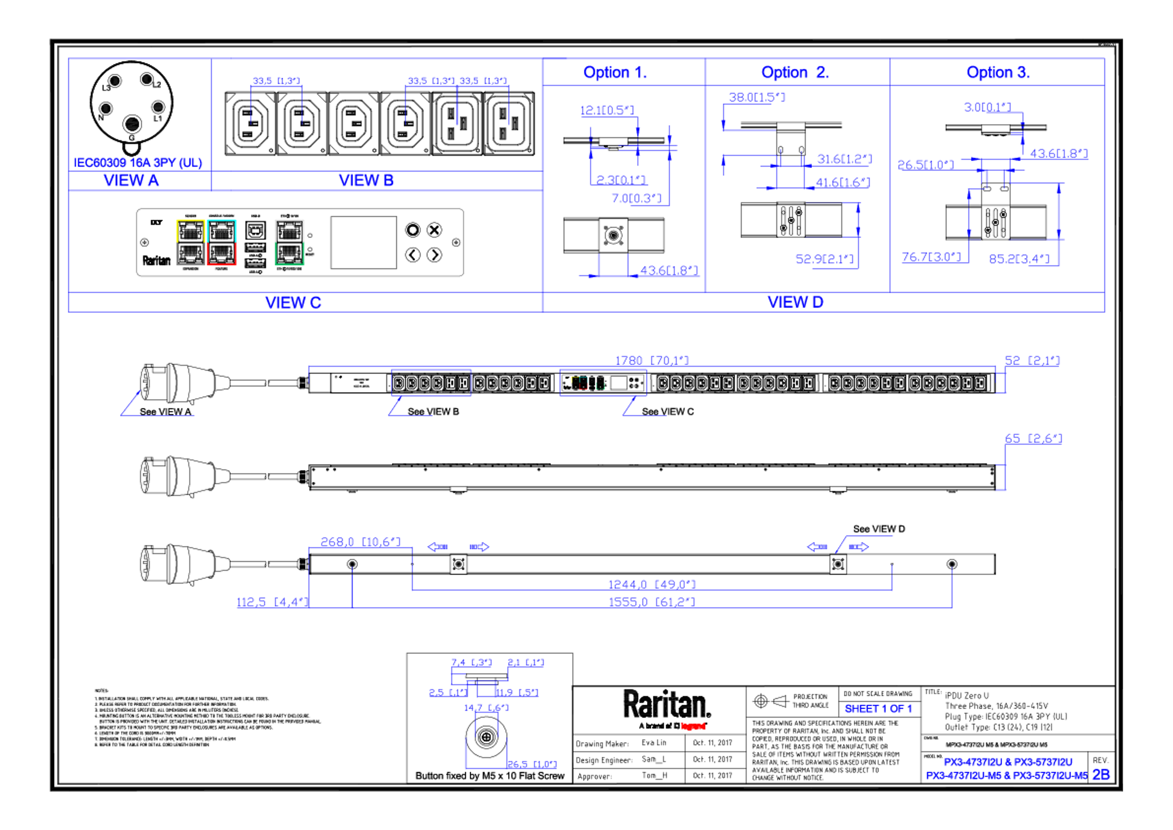 3PH, 415V AC, 16A (16A/PH rated); 36 outlets: 24x C13, 12x C19; plug: IEC 60309 3P+N+E 6h 16A (Wye Top-top feed), 11.5kVA; Outlet Metered, Zero U vertical PDU