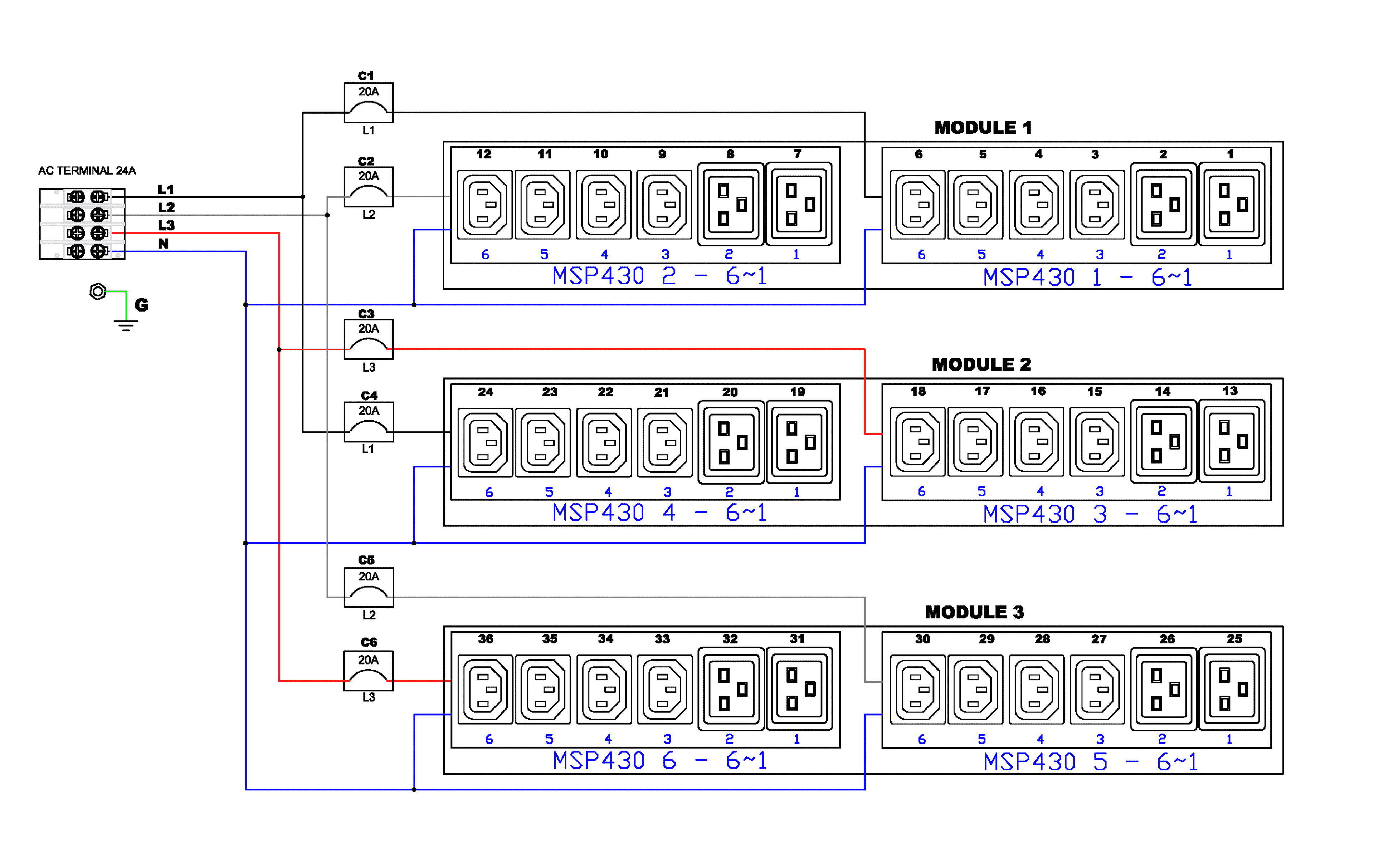 3PH, 415V AC, 30A (24A/PH rated); 36 outlets: 24x C13, 12x C19; plug: AC Terminal (Wye Bottom-bottom feed), 17.3kVA; Outlet Metered, Zero U vertical PDU