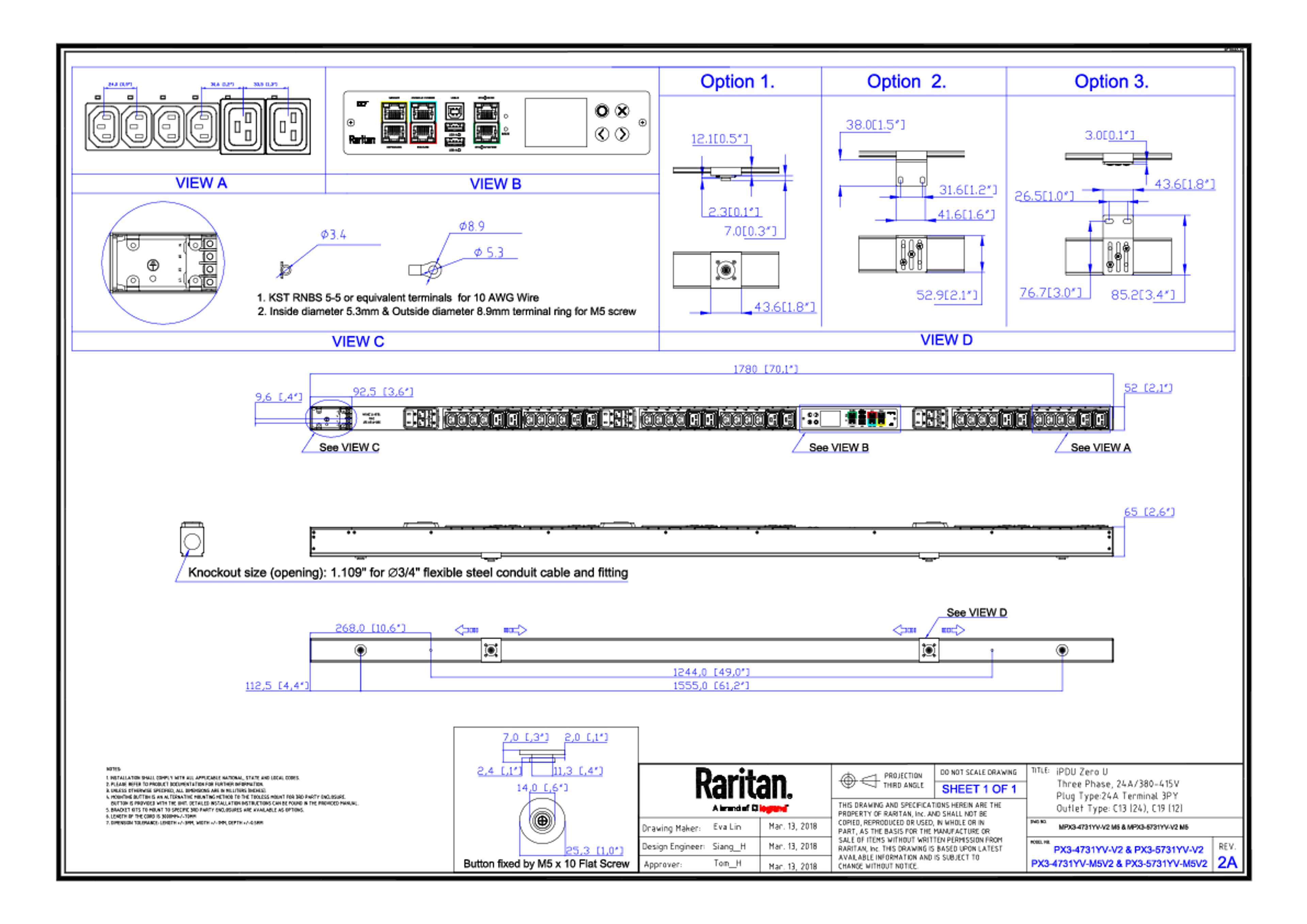 Monitored rack power distribution unit (0U [vertical], 17.3kVA, 36 outlets). INPUT: 415v (3-phase WYE), 24a - Hardwired [AC Terminal Block, No Cord]; OUTPUT: 24@ C13, 12@ C19 outlets; on 6@ 1-pole, 20a Overcurrent Protectors; FEATURES: Billing-Grade (+/- 1%) Energy Metering [kW, kVA, V, A, Power Factor] - per inlet, per breaker/fuse, per outlet; Remote network monitoring via HTML, JSON-RPC, SSH, Telnet, MODBUS/TCP, and SNMPv3. Onboard embedded processor with minimum 536MHz clock speed, 16MB SPI Flash, and 64MB DDR2 RAM. Cascading upto 16 PDU's using single Ethernet or USB connection. Environmental monitoring [temp/humidity] capable – up to 32 sensors. Individual outlet numbers labeled on chassis. Automated deployment via TFTP, DHCP, SSH(CLI), or USB Flash Drives. WiFi Capable. USB Webcam Capable. iPad/iPhone/Android App. Dual 10/100/1000 Ethernet port. Tri-color status LED per receptacle. Breaker metering and alarming (0V detection). Max Dimensions 52mm x 65mm x 1780mm (2.1in x 2.6in x 70.1in). Max Weight TBD. Maximum ambient temperature 60C at full load.