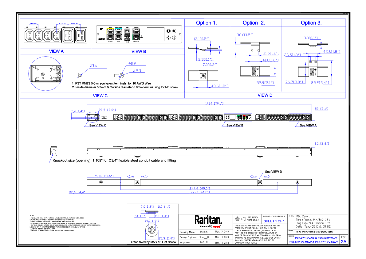 3PH, 415V AC, 30A (24A/PH rated); 36 outlets: 24x C13, 12x C19; plug: AC Terminal (Wye Bottom-bottom feed), 17.3kVA; Outlet Metered, Zero U vertical PDU