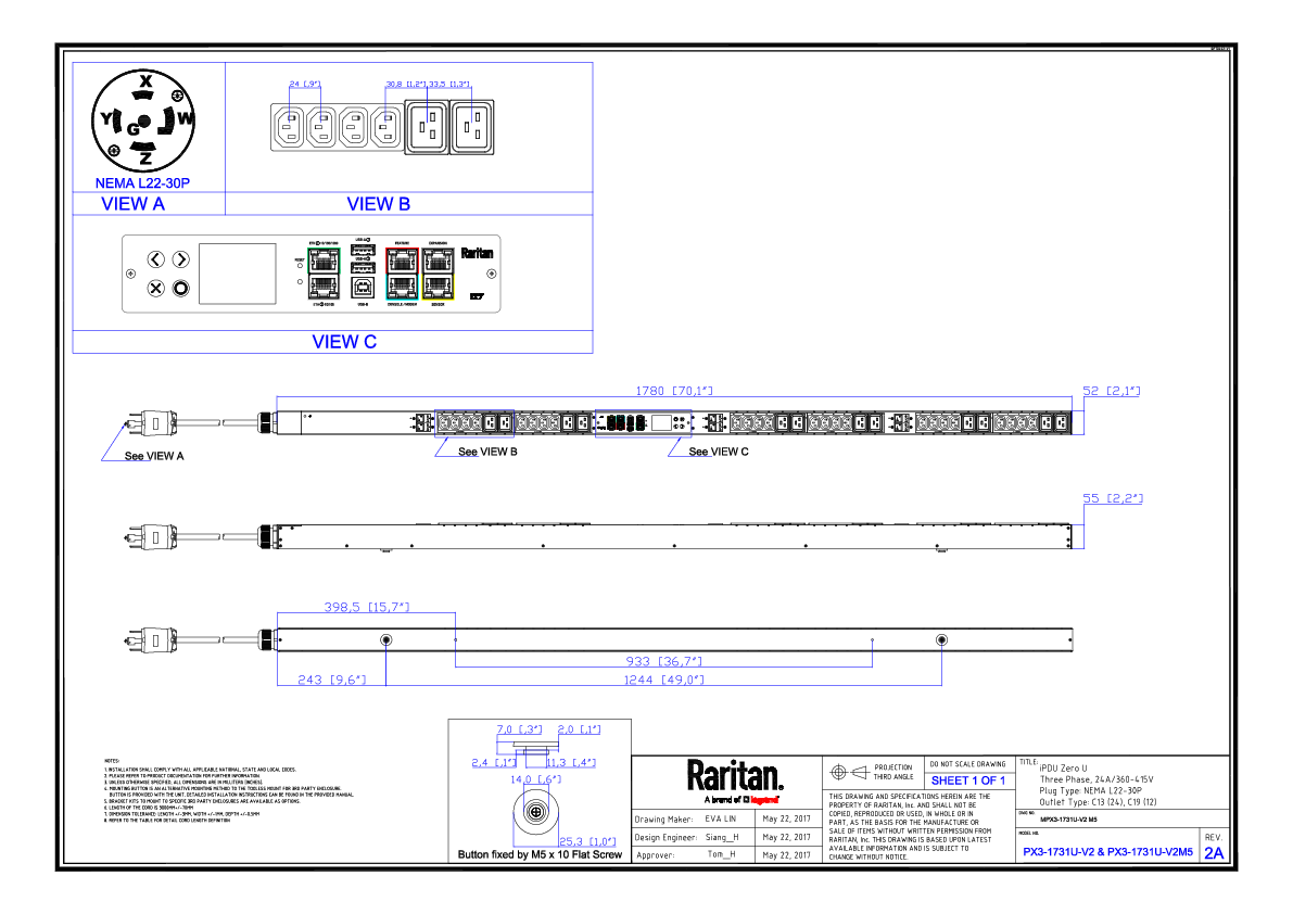 3PH, 415V AC, 30A (24A/PH rated); 36 outlets: 24x C13, 12x C19; plug: NEMA L22-30P (Wye Top-top feed), 17.3kVA; Unit Metered, Zero U vertical PDU