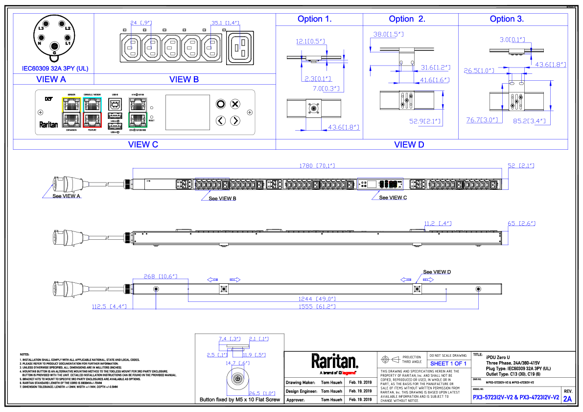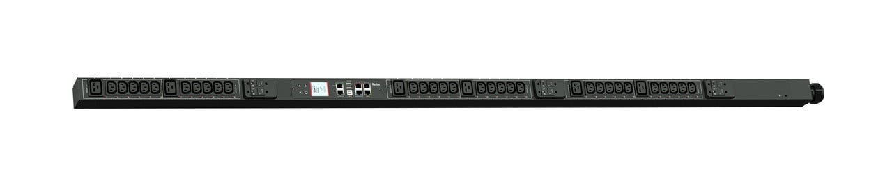 3PH, 415V AC, 32A (24A/PH rated); 36 outlets: 30x C13, 6x C19; plug: IEC 60309 3P+N+E 6h 32A (Wye Bottom-bottom feed), 17.3kVA; Outlet Metered/Switched, Zero U vertical PDU