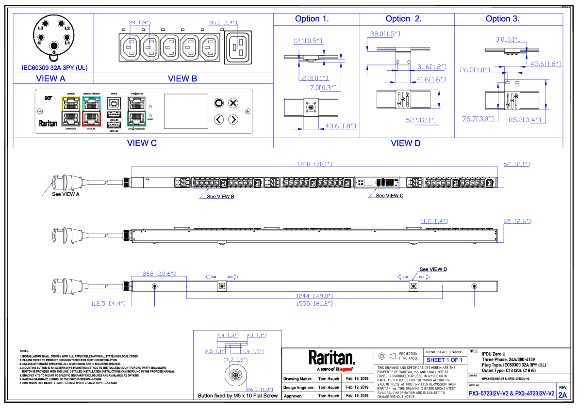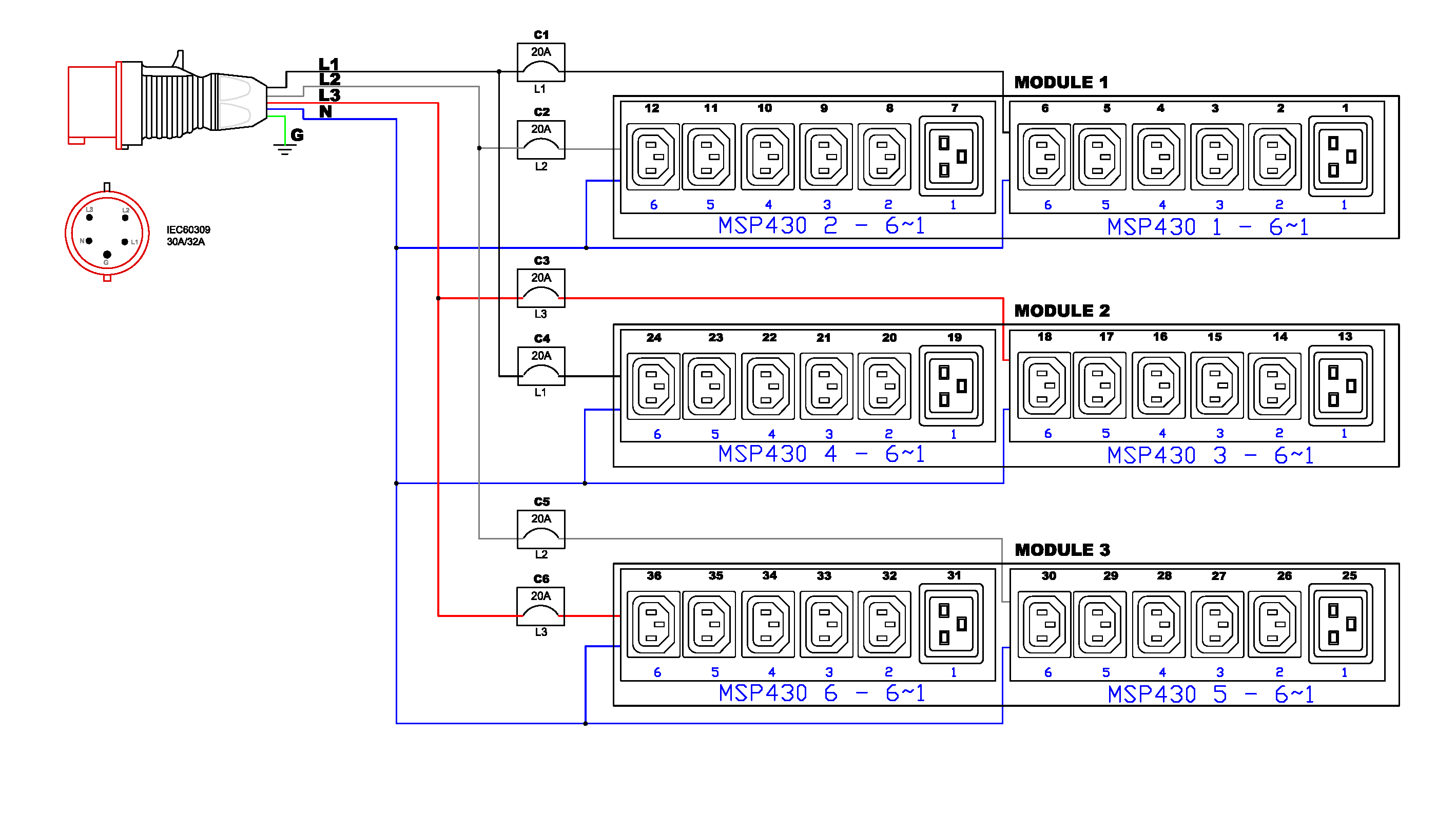 3PH, 415V AC, 32A (24A/PH rated); 36 outlets: 30x C13, 6x C19; plug: IEC 60309 3P+N+E 6h 32A (Wye Bottom-bottom feed), 17.3kVA; Outlet Metered/Switched, Zero U vertical PDU