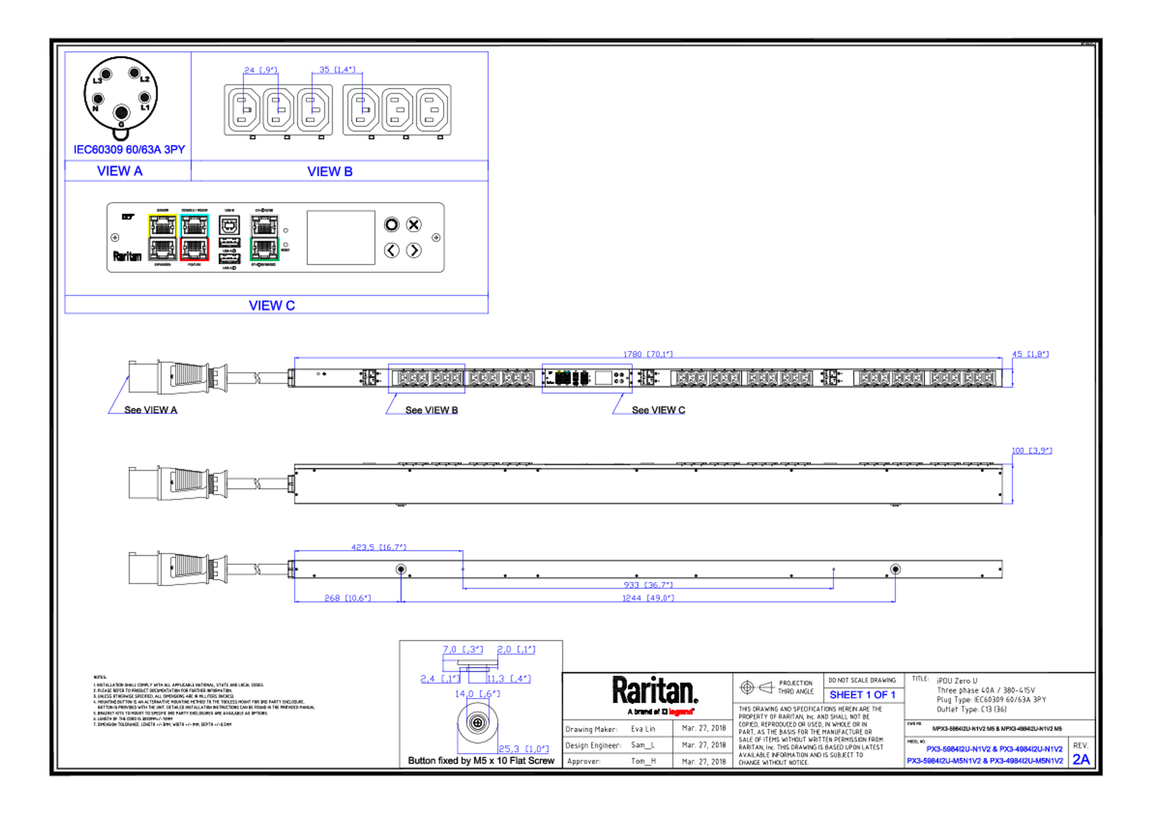 3PH, 415V AC, 60A (40A/PH rated); 36 outlets: 36x C13; plug: IEC 60309 3P+N+E 6h 60A (Wye Top-top feed), 28.8kVA; Outlet Metered/Switched, Zero U vertical PDU,